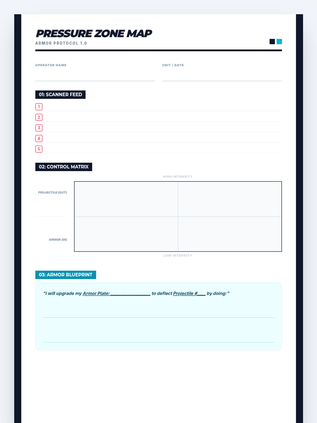 The student worksheet for the Executive Armor Lab, featuring a stressor identification list, a 2D control matrix for visualization, and a strategy-building blueprint area.