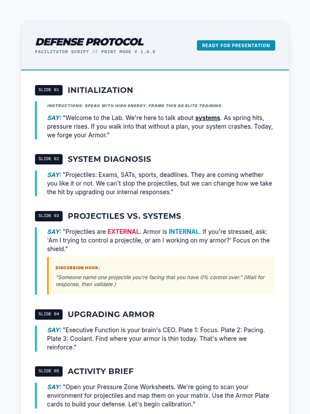 A facilitator's script for the Executive Armor Lab, providing a detailed talk-track to guide students through the slides with a high-performance, technical tone.
