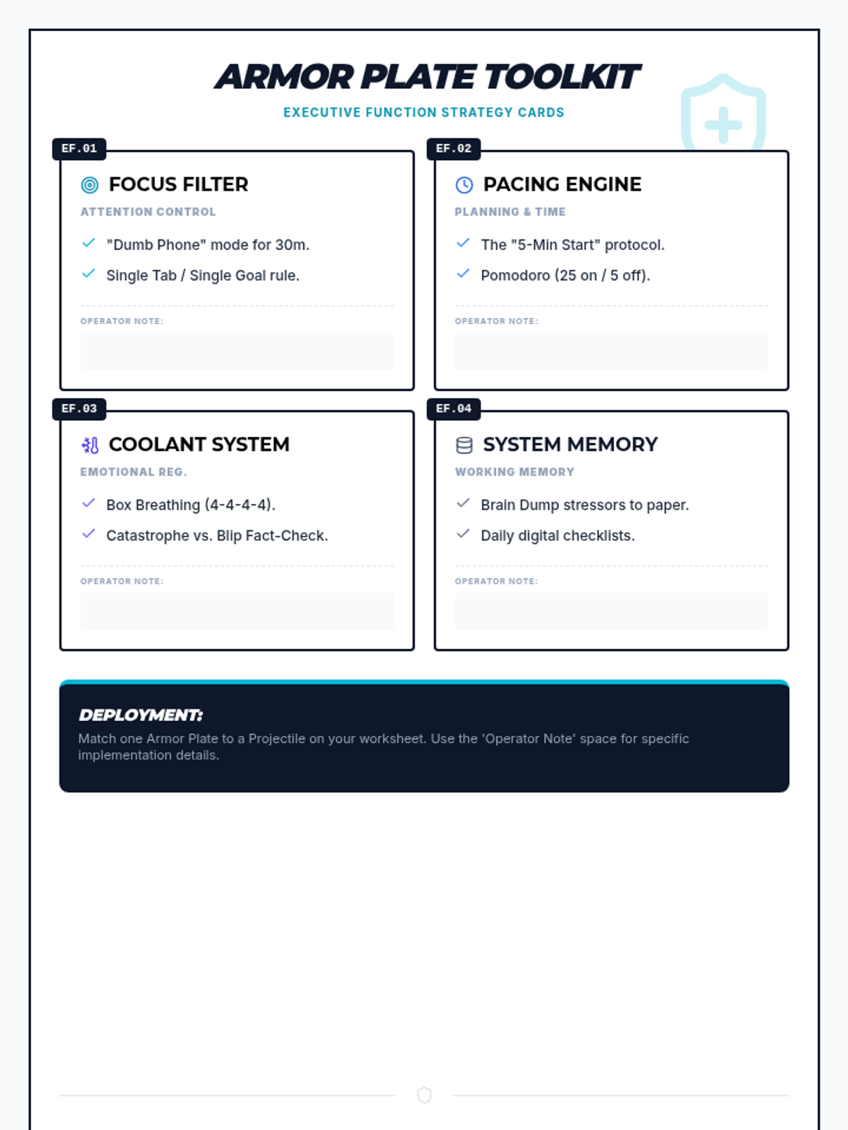 A set of "Armor Plate" strategy cards providing concrete executive function tools for high school students to manage stressors, designed for use with the Pressure Zone Worksheet.