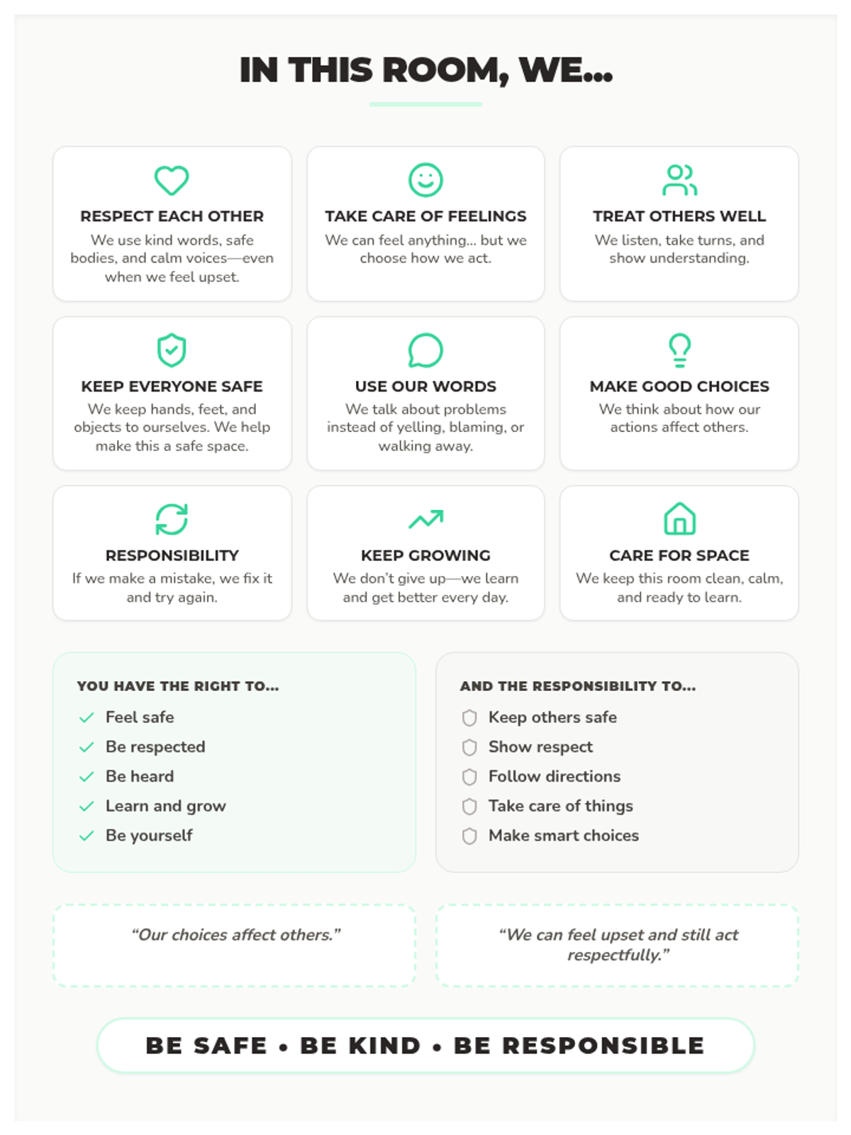 A simple, modern minimalist poster for a school social worker's office. It features soft colors, clean typography, and visual icons to clearly communicate classroom expectations, rights, and responsibilities for elementary students.