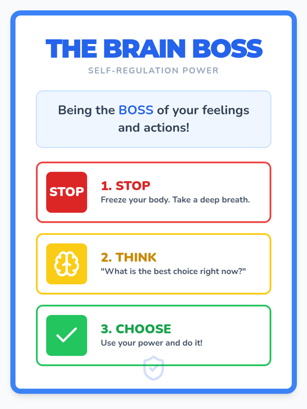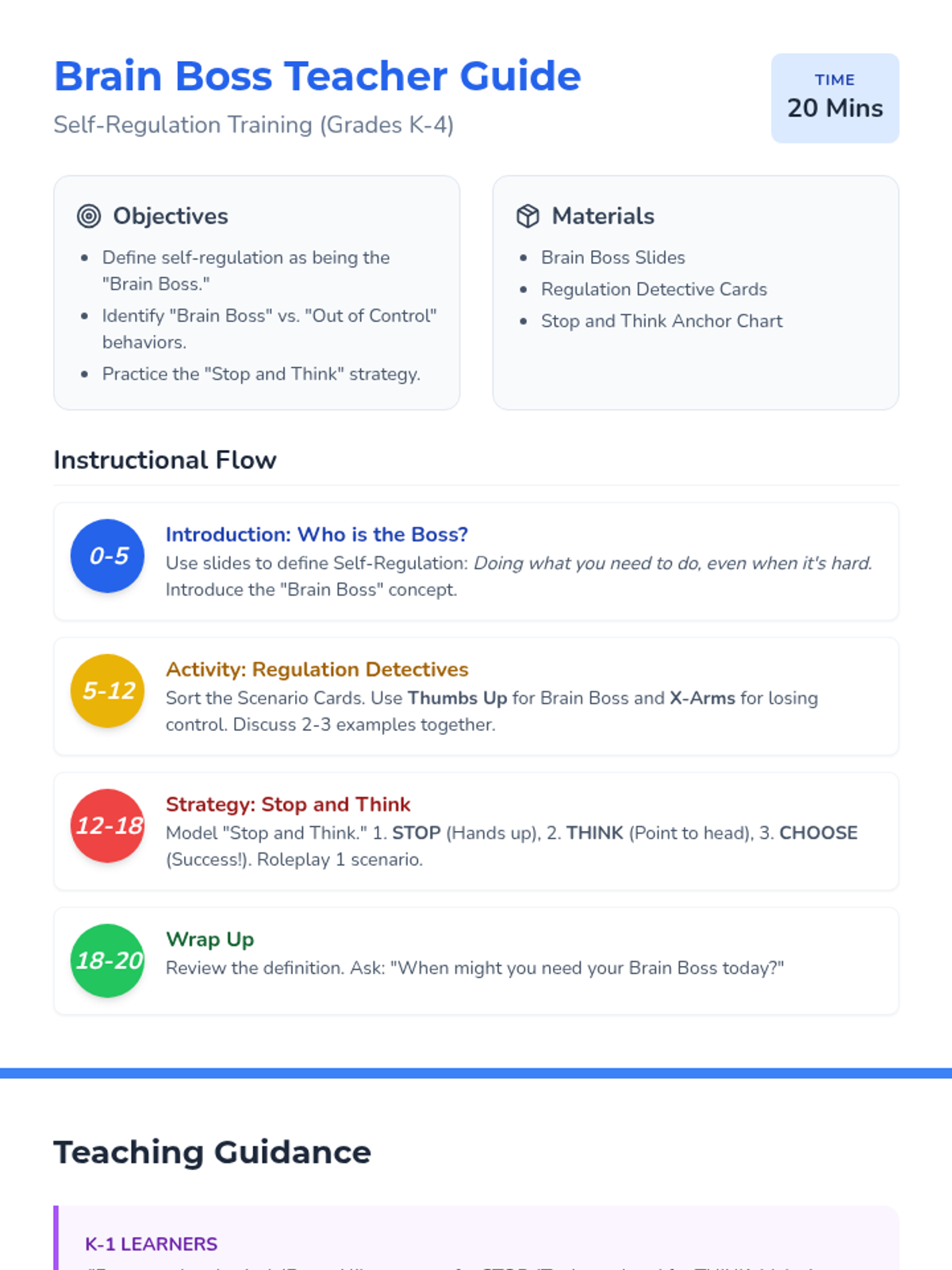 A comprehensive 20-minute lesson plan for teaching self-regulation to K-4 students, featuring the 'Brain Boss' concept and a 'Stop and Think' strategy.