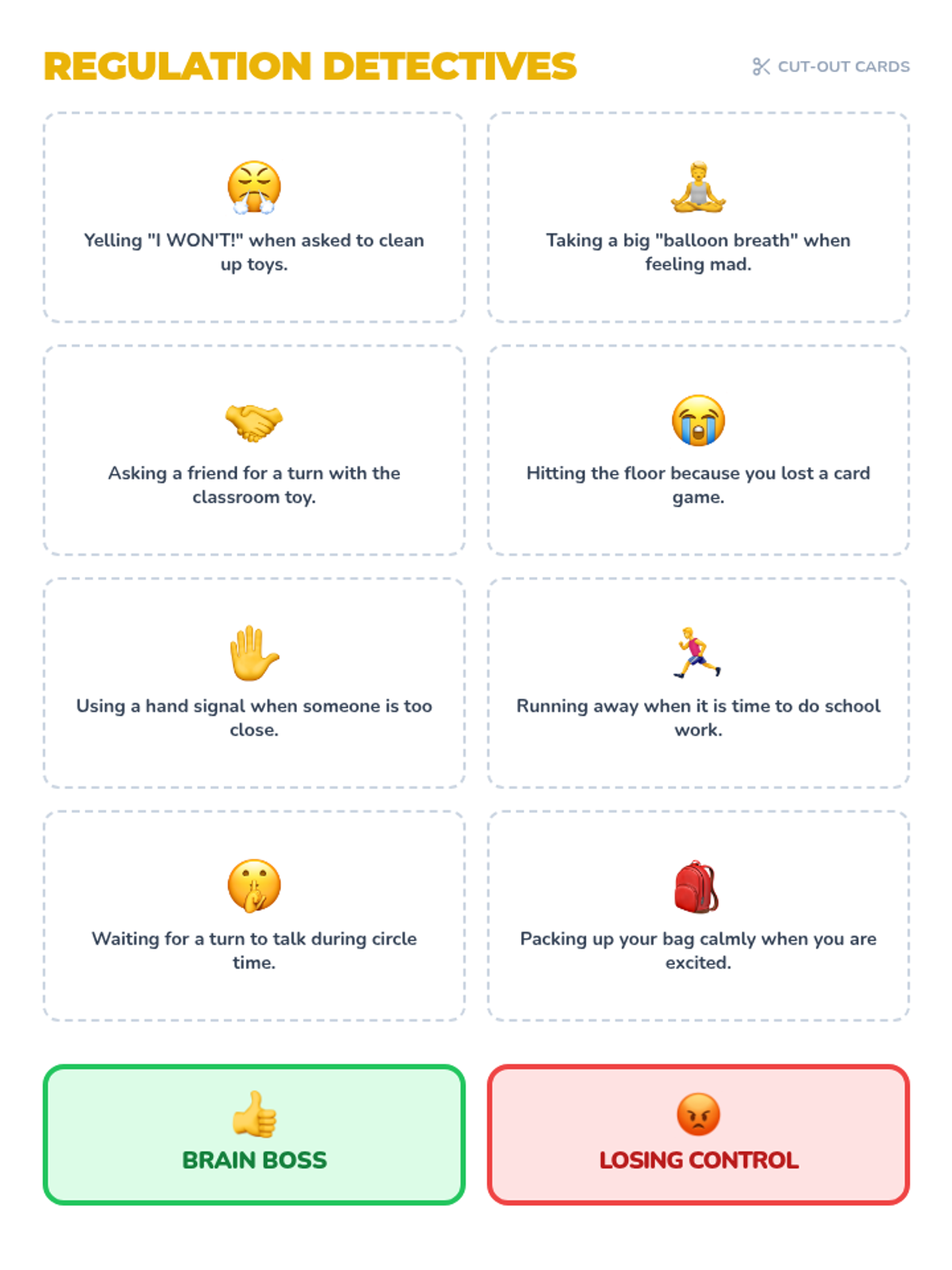 A set of 8 printable scenario cards and sorting headers for students to identify regulated 'Brain Boss' behaviors versus 'Losing Control' behaviors.
