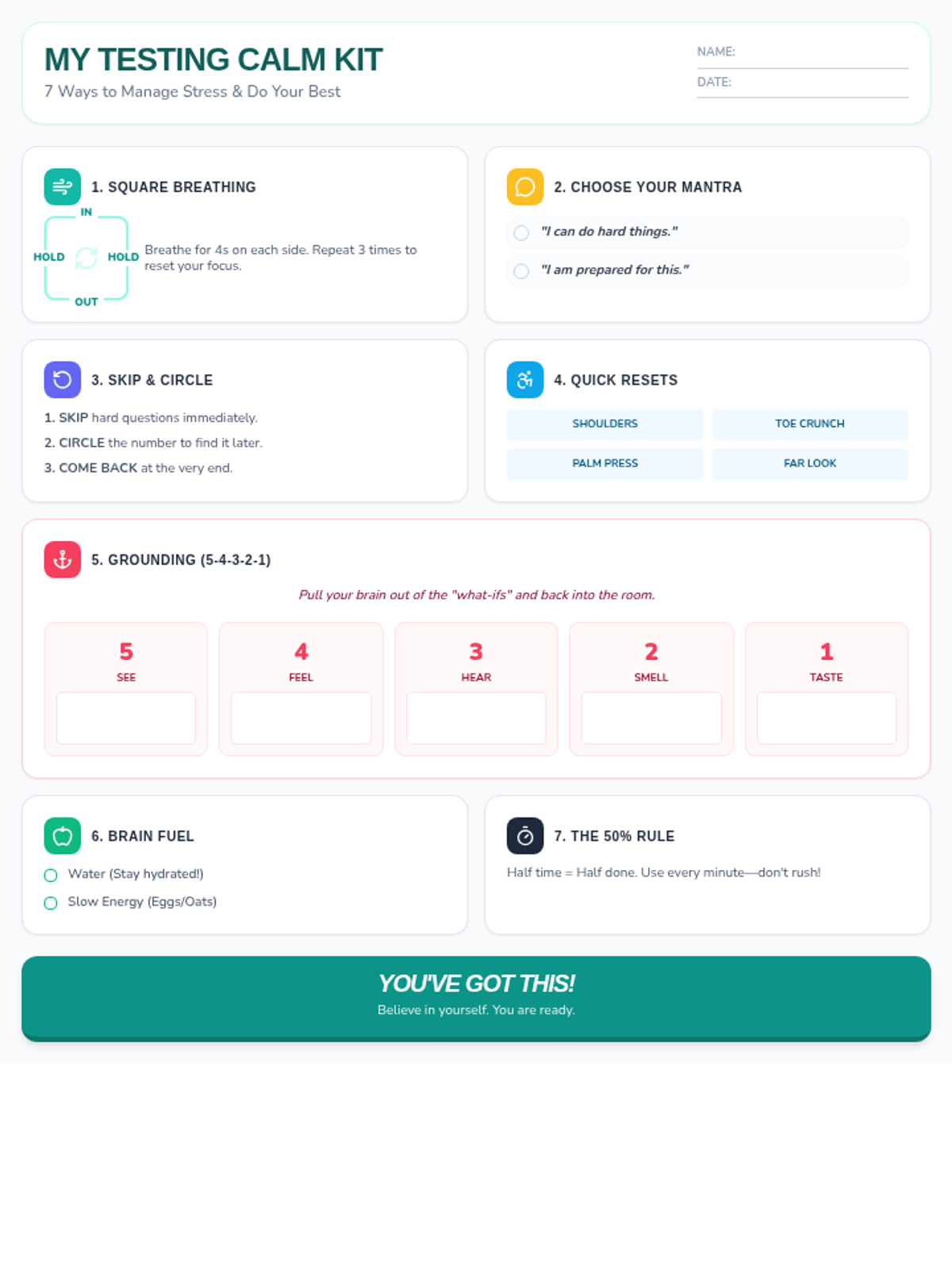 A printable reference sheet for students summarizing 7 stress-management strategies to use during tests, designed to be kept in a folder or notebook.