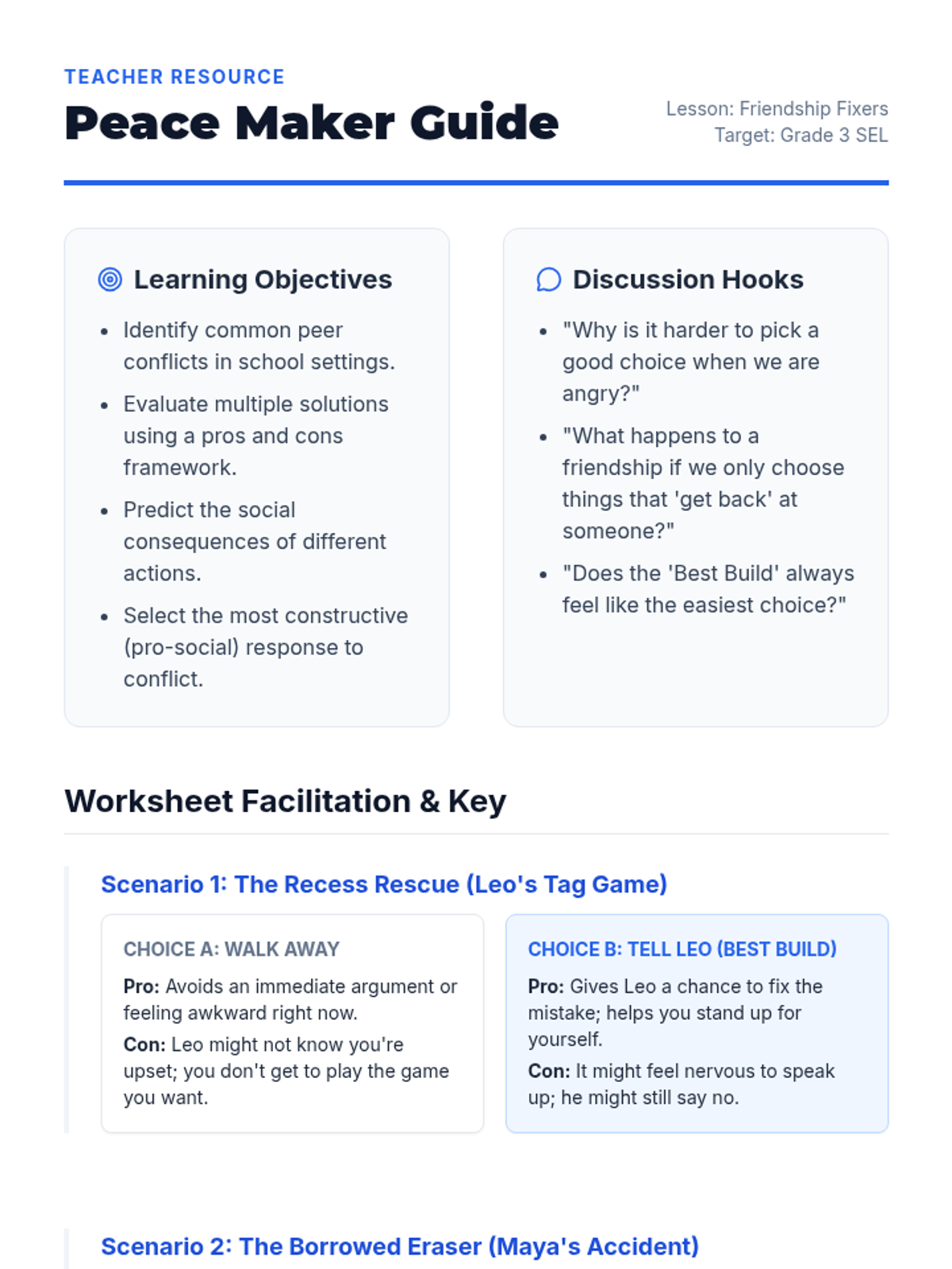 A revised teacher's guide for the Friendship Fixers lesson, with improved page breaks, answer key formatting, and added sections for extension activities and differentiation to better support educators.