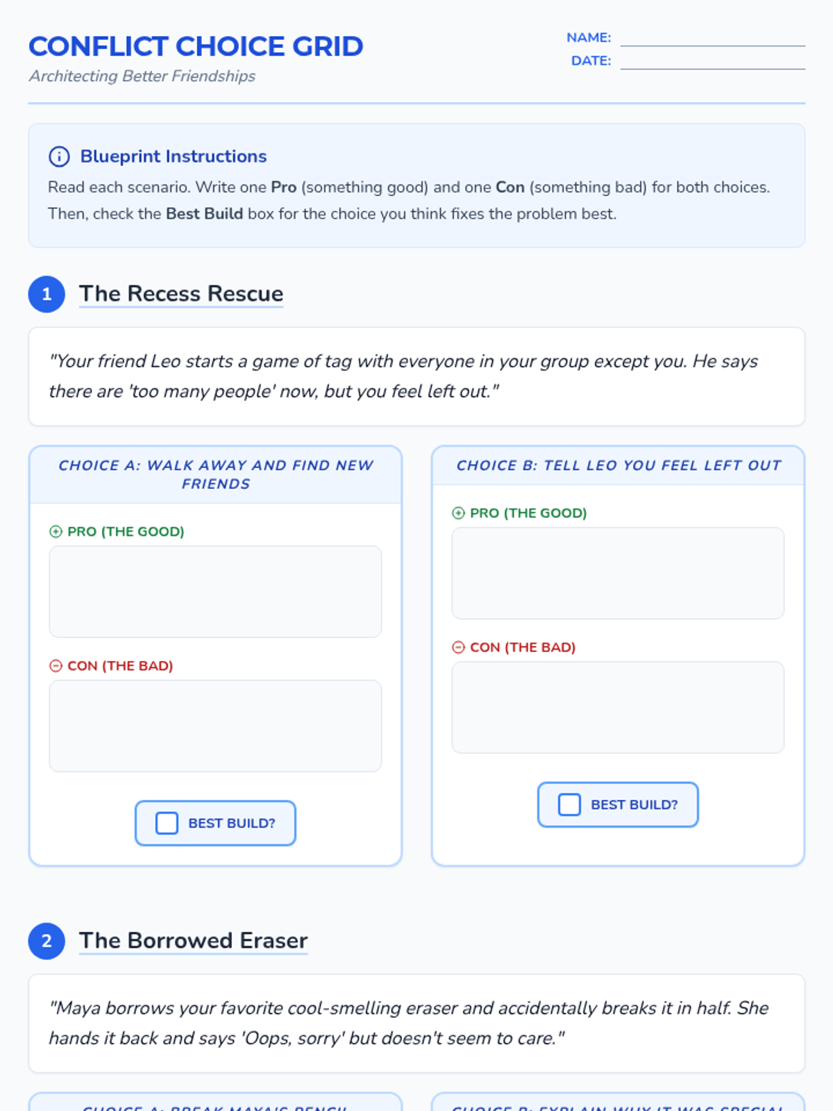 A revised 2-page worksheet featuring relatable peer conflict scenarios where students evaluate two possible solutions using a pros and cons grid before deciding on the best course of action. Styling and spacing optimized for 3rd grade.