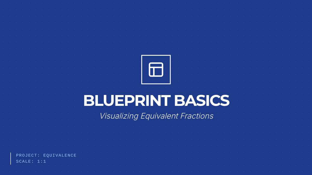 A set of instructional slides introducing equivalent fractions through area models and number lines with an architectural blueprint theme. Revised for better spacing, visual alignment, and includes new practice problems.