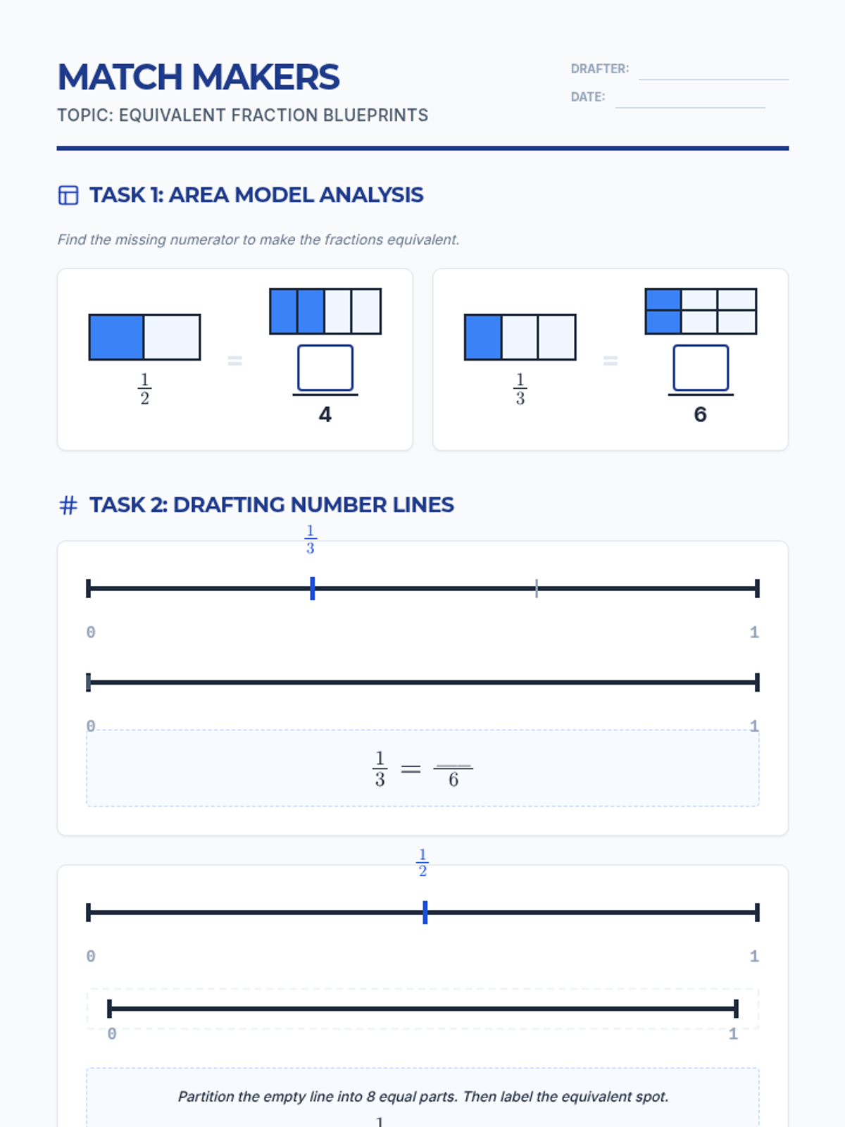 A student homework worksheet featuring area models and number lines for identifying and generating equivalent fractions, designed with an architectural blueprint aesthetic. Revised to fix LaTeX rendering, shading issues, and page breaks.