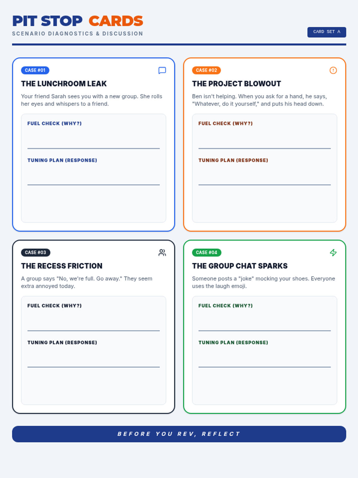 A set of four scenario cards designed for group discussion, prompting students to diagnose social friction in common peer conflicts and propose empathetic solutions.