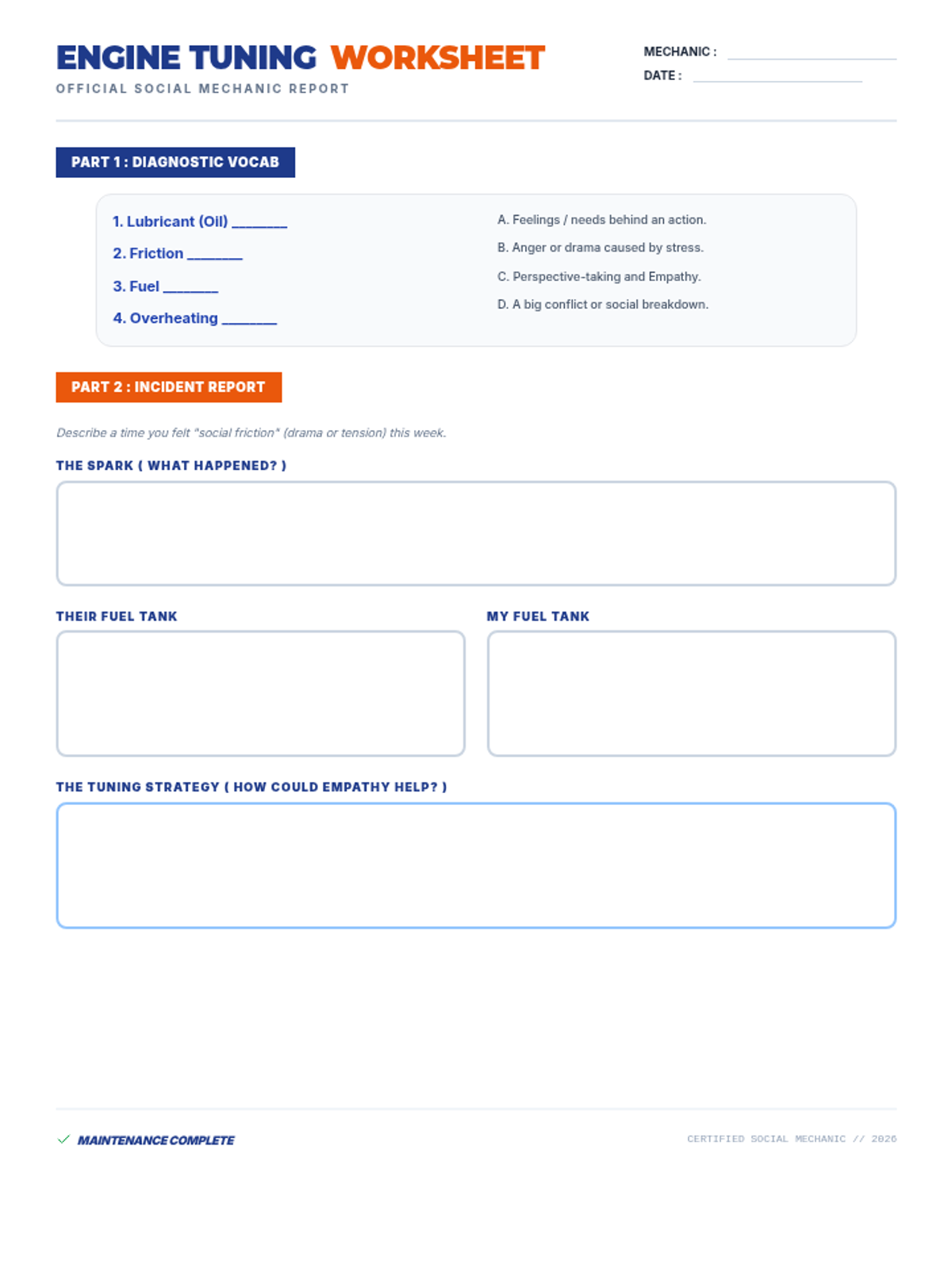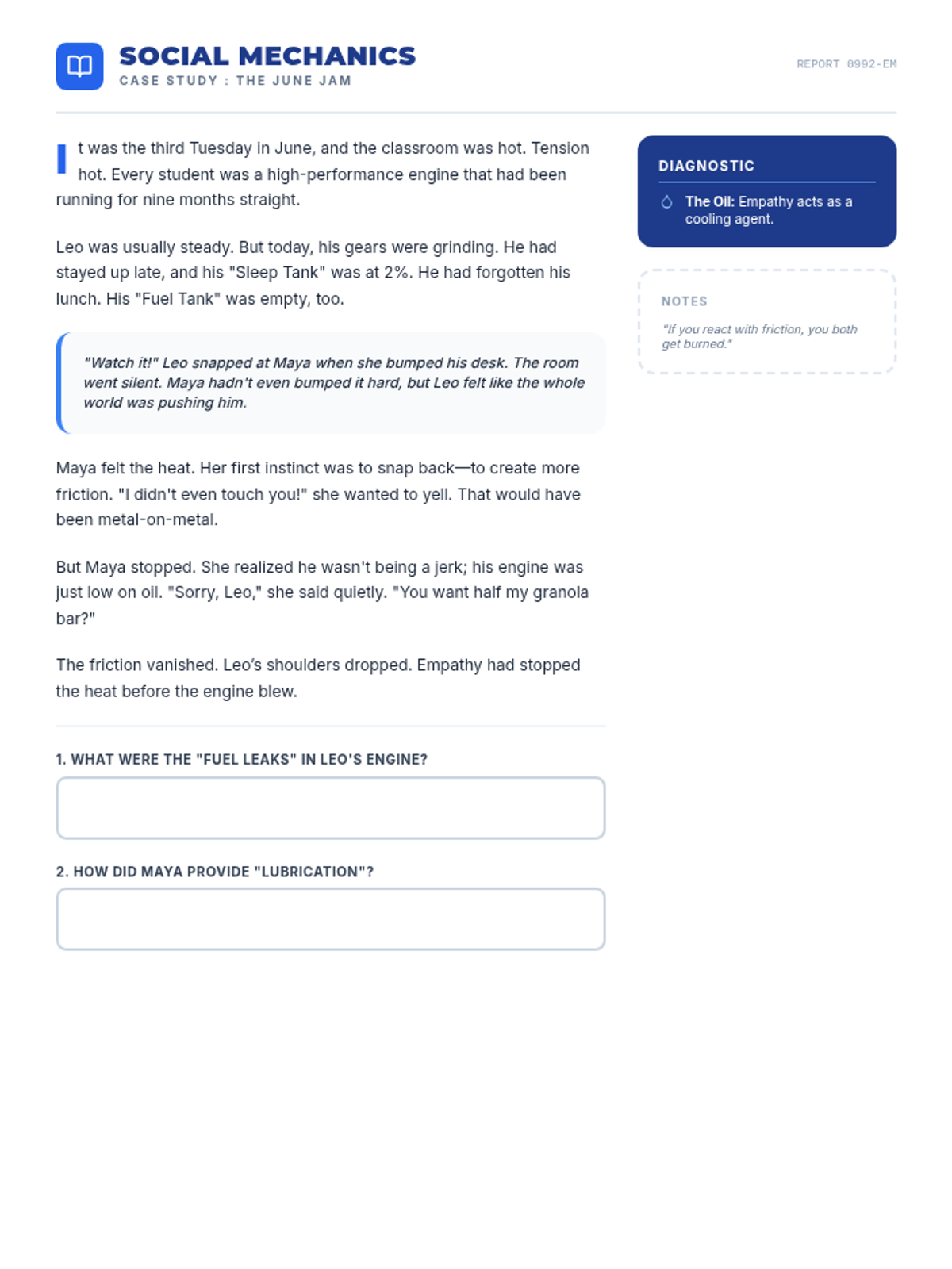 A visual slide deck that introduces the 'Empathy Engine' metaphor, explaining social friction, the role of empathy as lubrication, and providing a diagnostic checklist for students to analyze peer behavior.