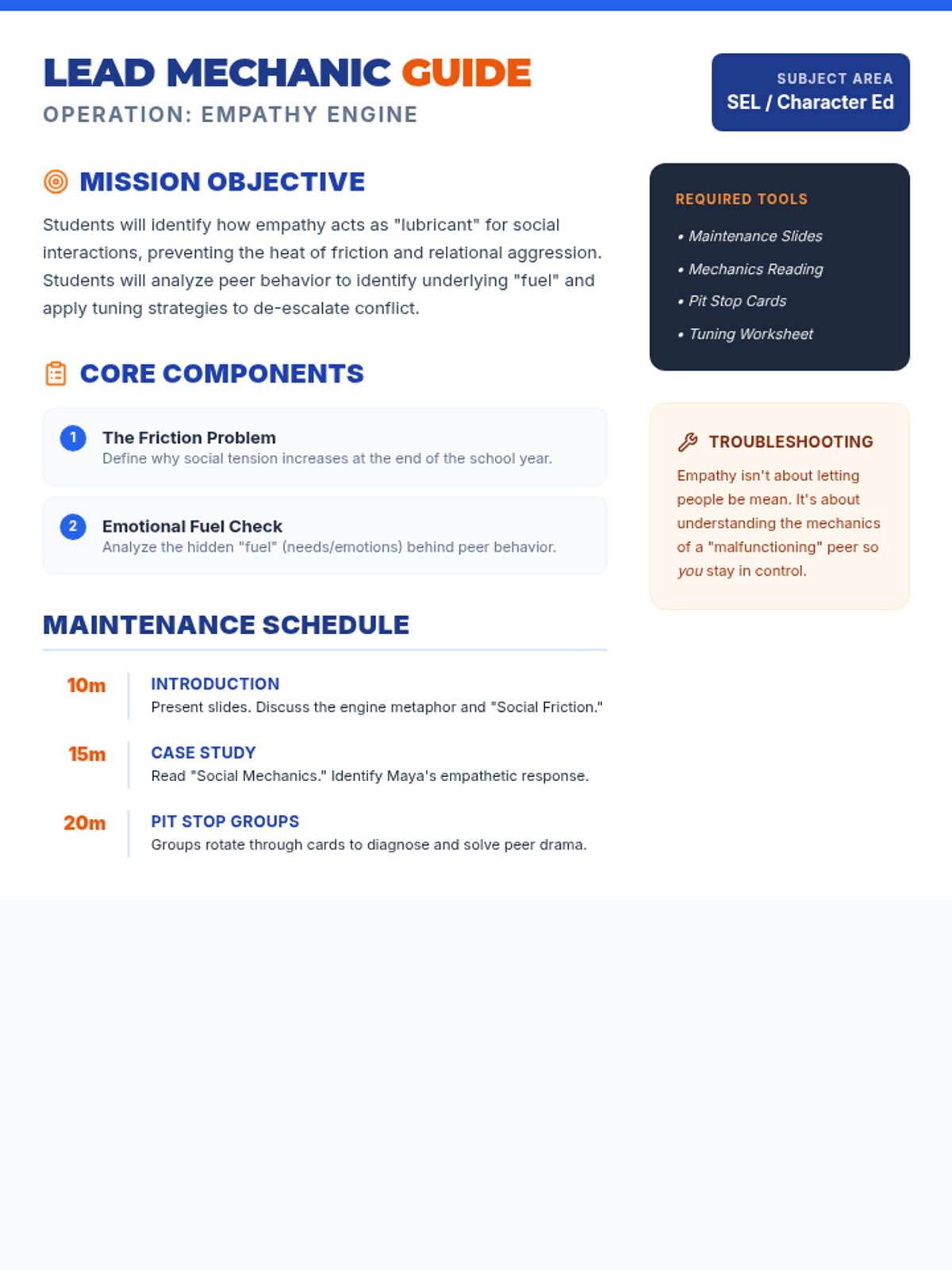 A comprehensive teacher guide for the Empathy Engine lesson, outlining learning objectives, terminology using the mechanical metaphor, and a step-by-step instructional procedure to address end-of-year social friction.