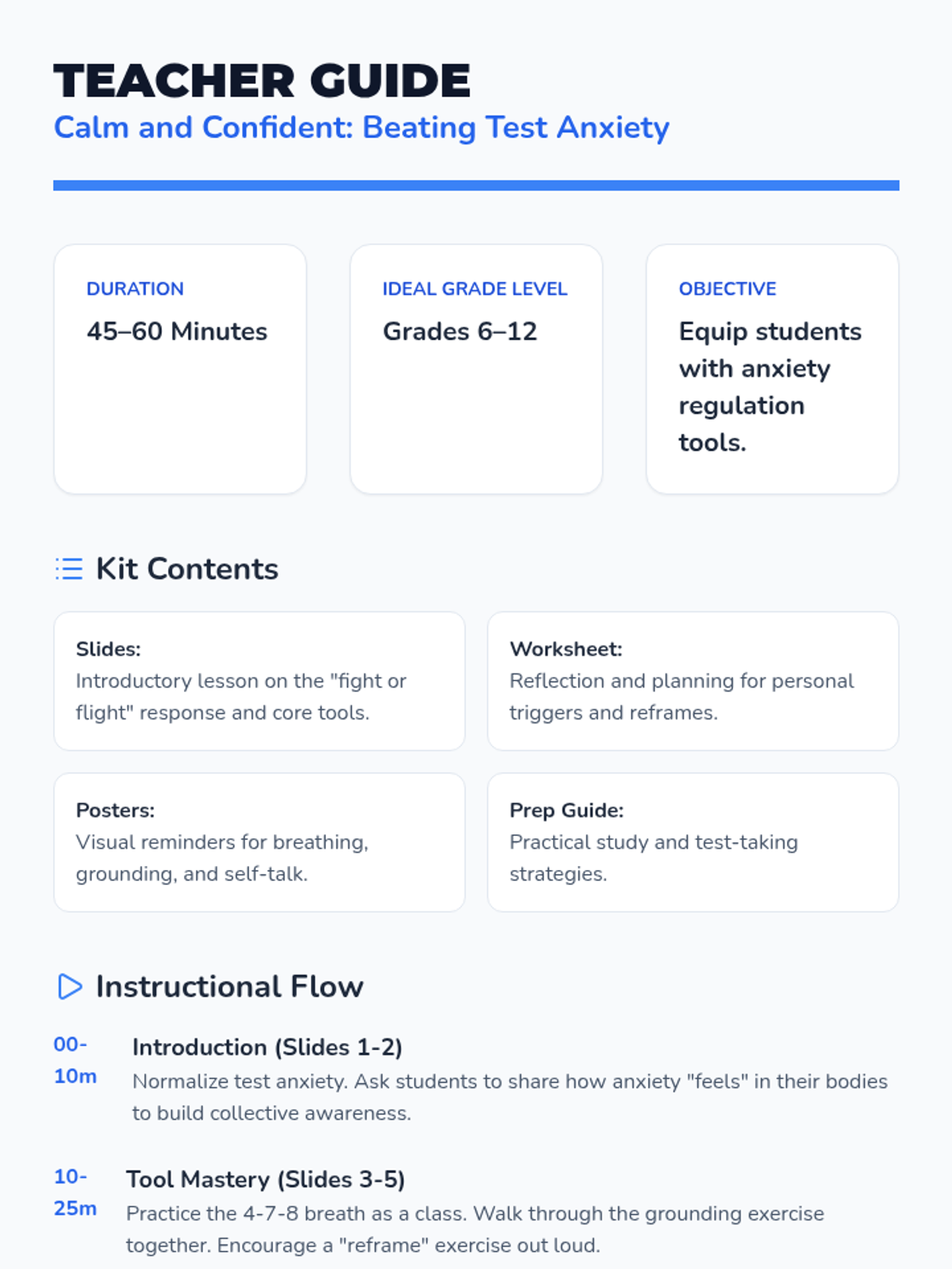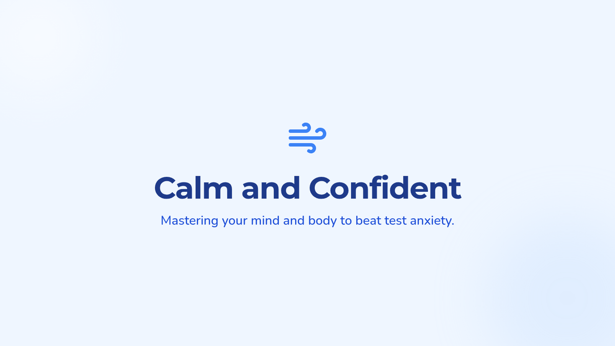 A visually engaging presentation that defines test anxiety and provides four concrete tools: breathing, grounding, positive self-talk, and preparation habits.