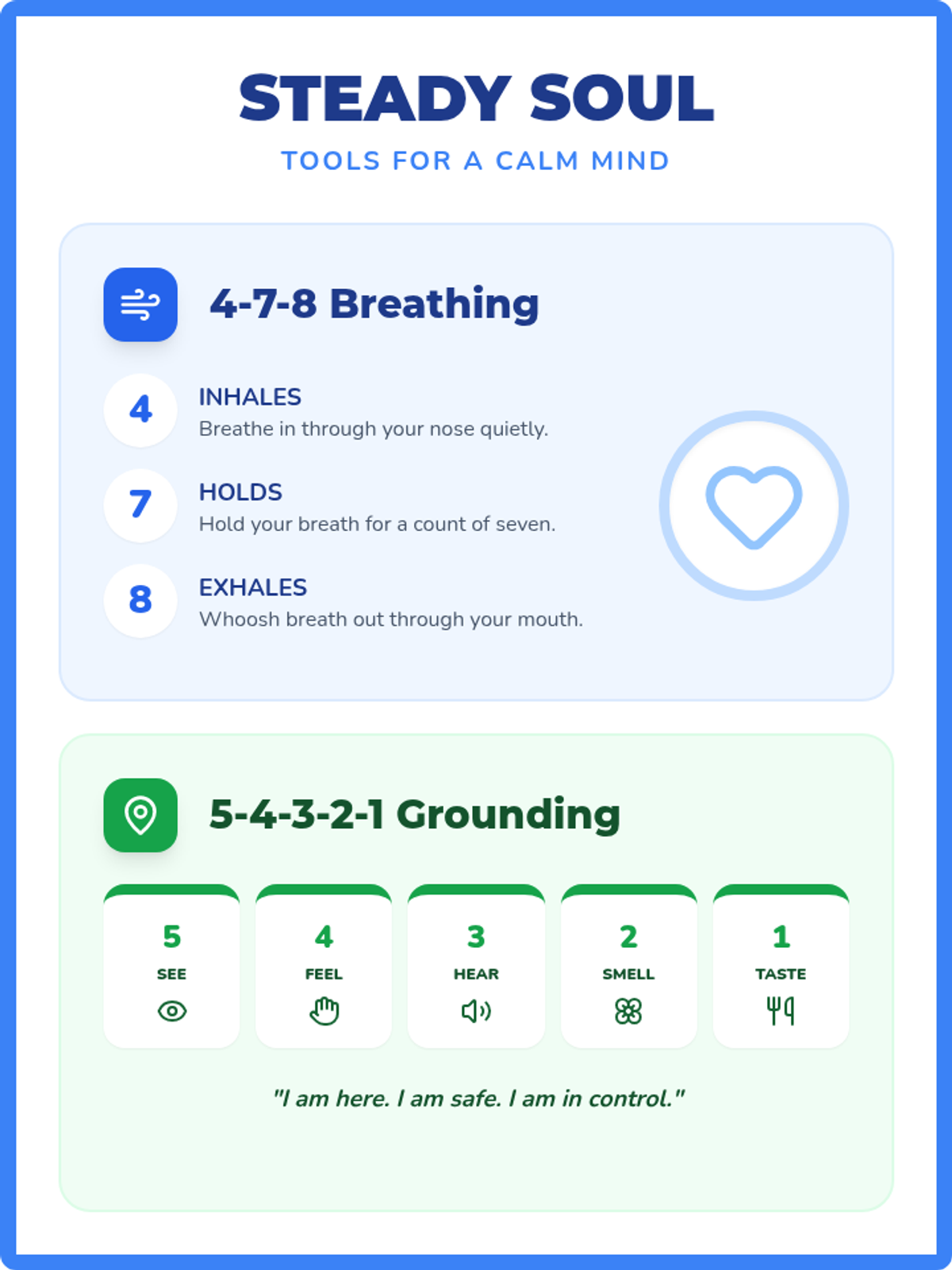 A high-impact classroom poster illustrating the 4-7-8 breathing technique and the 5-4-3-2-1 grounding method for quick reference during stressful moments.