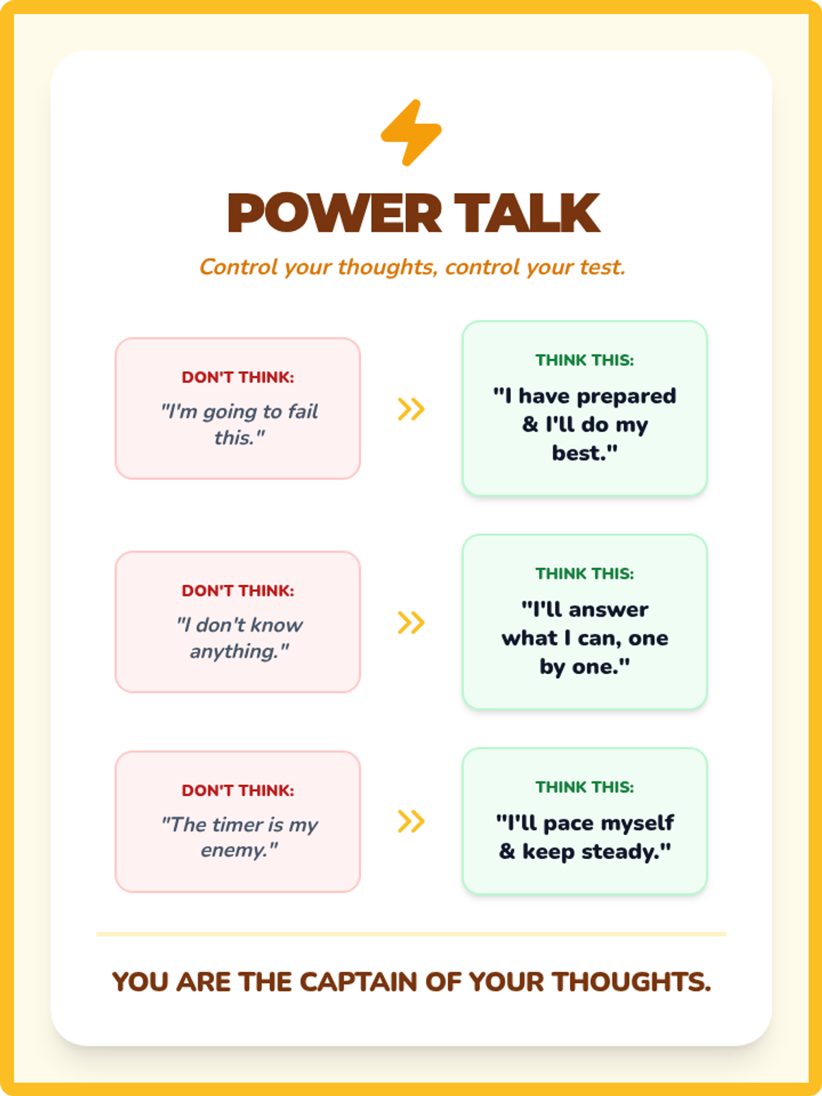 An empowering classroom poster that helps students reframe common anxious thoughts into productive, confident mindsets.