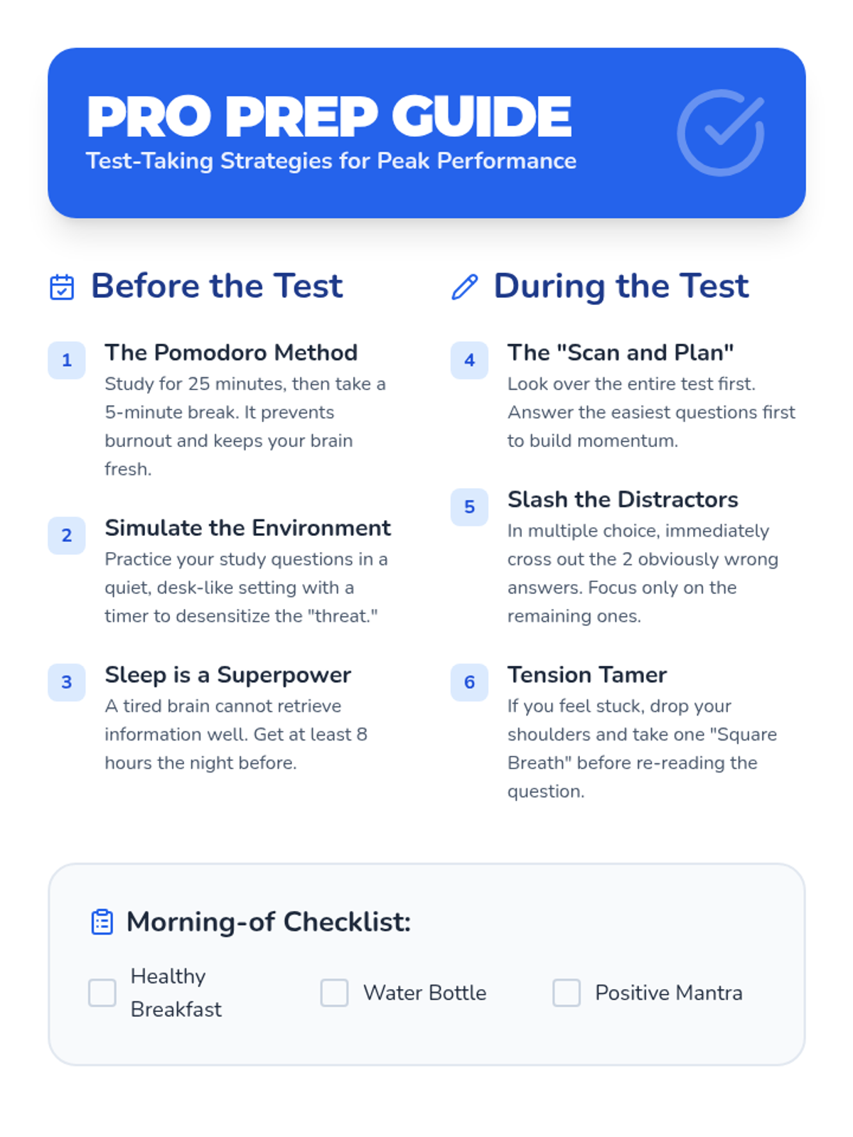A practical reference sheet for students featuring before-and-during test-taking tips, including study habits, test-day momentum builders, and a morning checklist.
