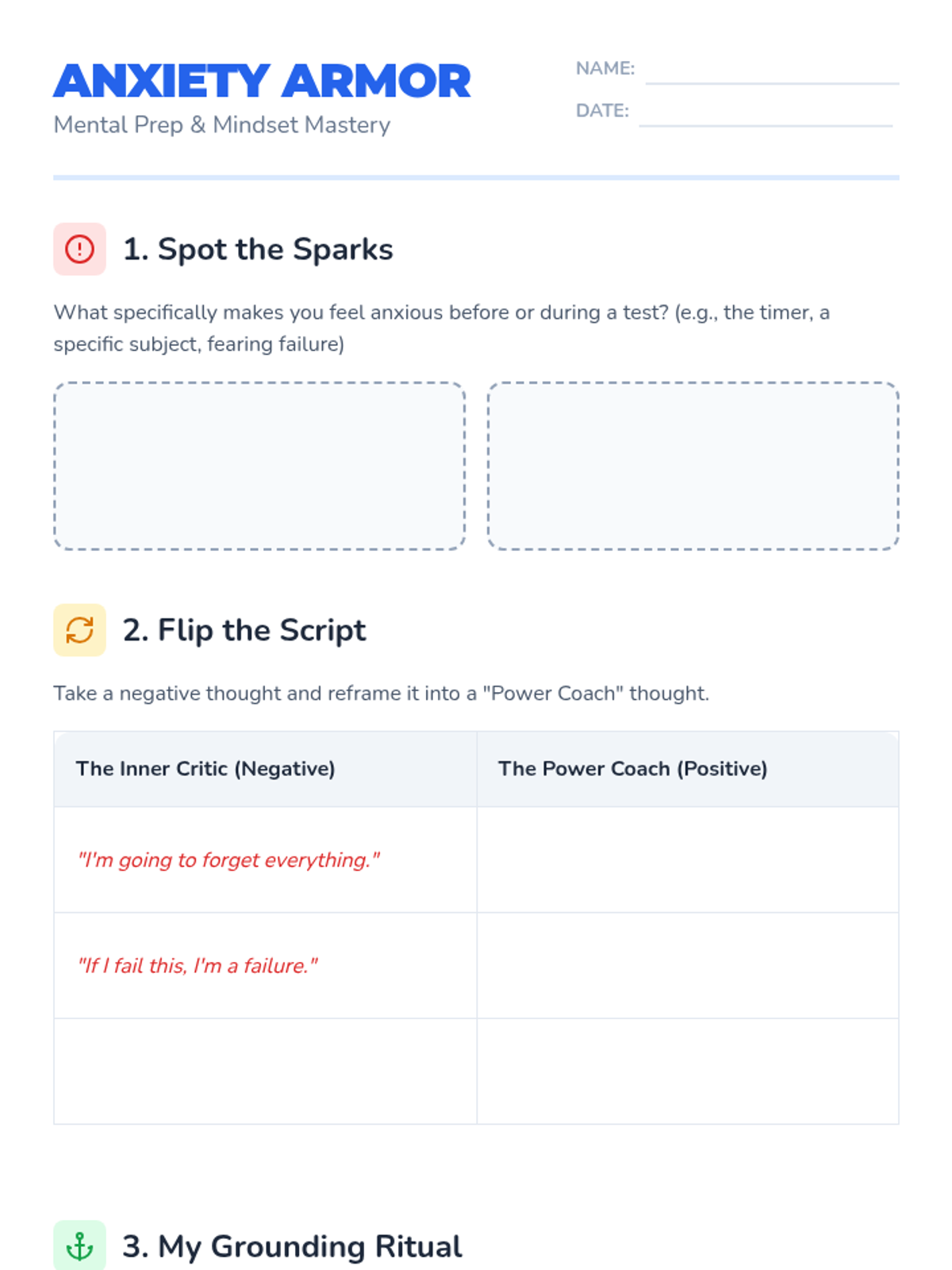 A reflective worksheet for students to identify anxiety triggers, practice reframing negative thoughts, and commit to grounding rituals and preparation habits.