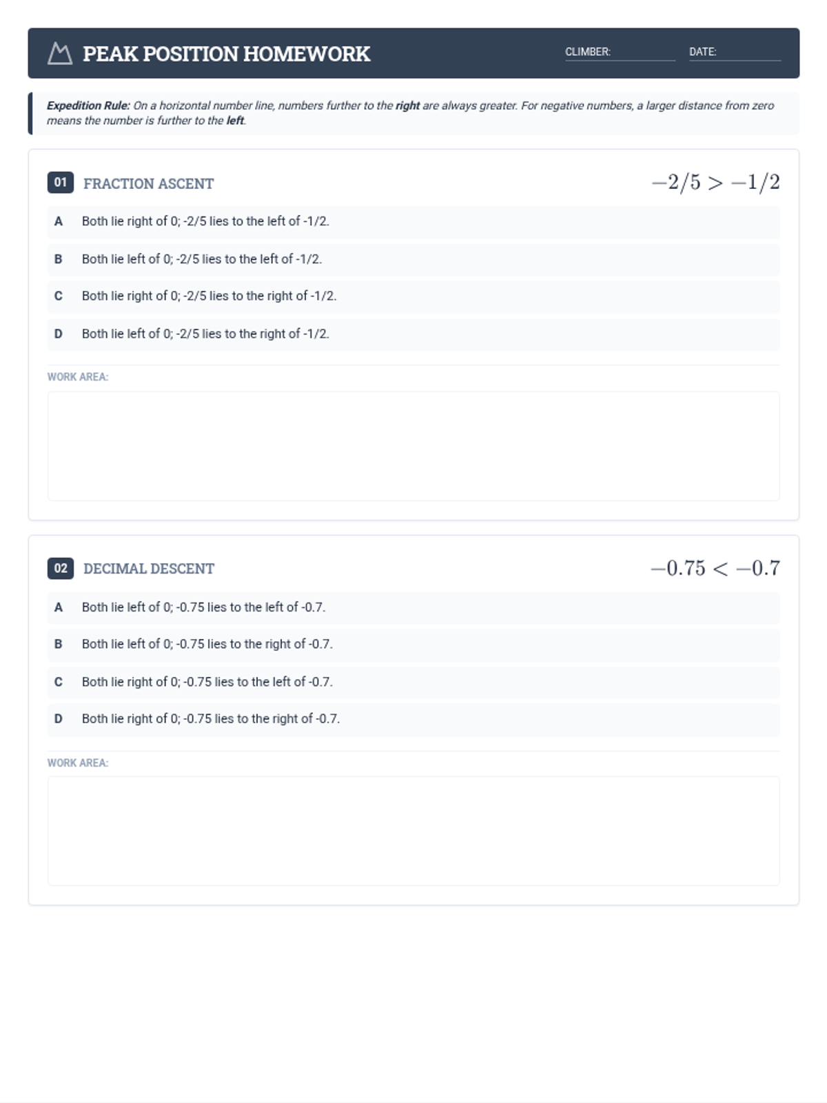 A mountain-themed homework assignment containing four multiple-choice questions on rational number inequalities. Reformatted to fit exactly two questions per page across two pages total, with clear work areas for each problem. Questions use standard text for simple fractions to ensure rendering stability.