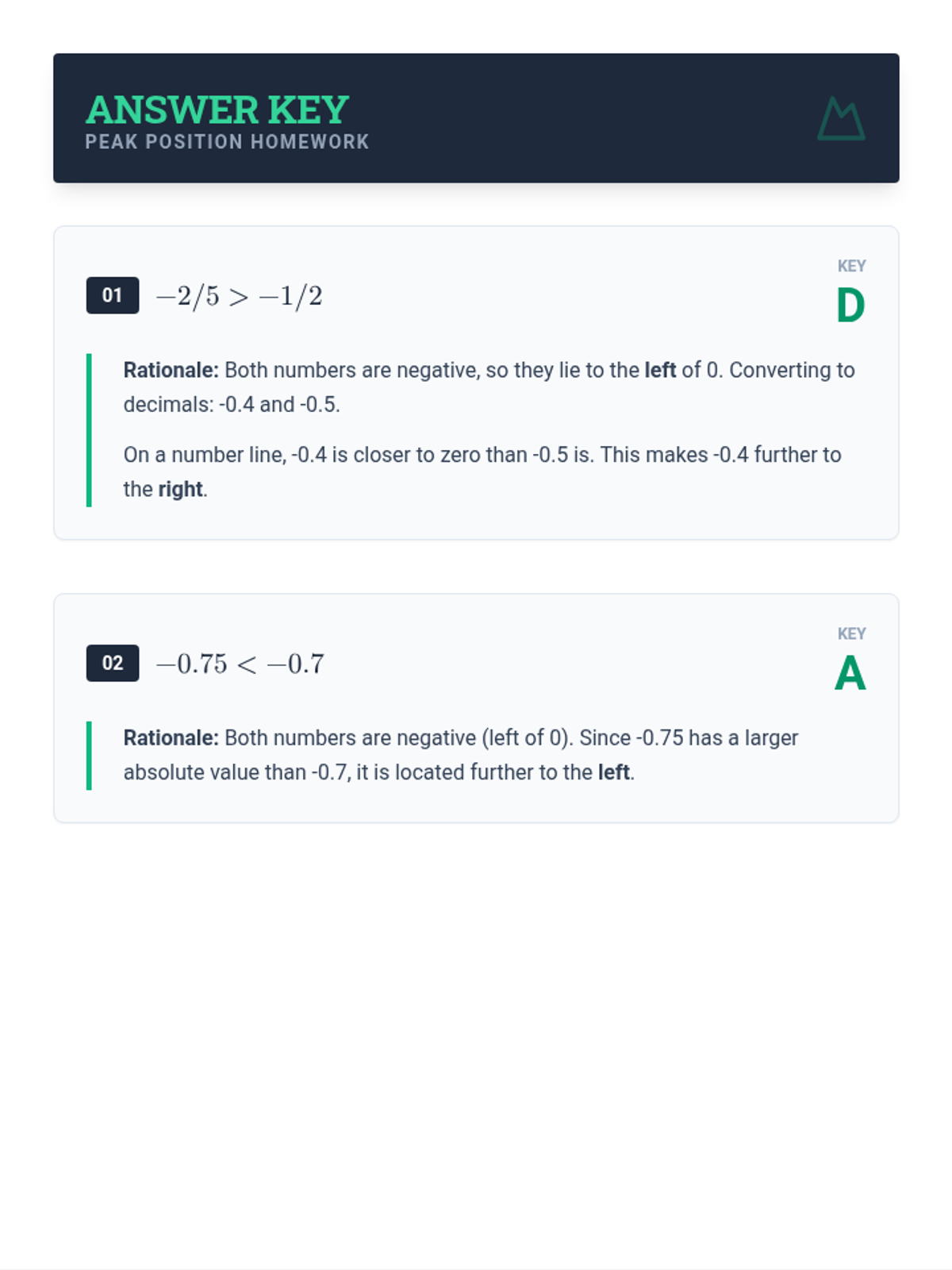 An answer key for the Peak Position Homework, providing correct choices and detailed rationales for each question. Features improved LaTeX formatting, higher contrast text, and a 2-page layout to match the homework assignment.