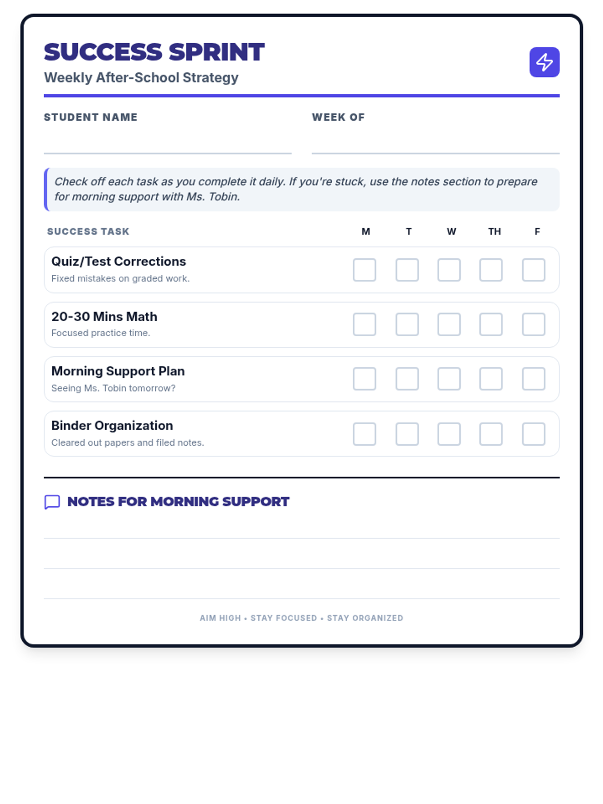 A sleek, one-page after-school success checklist for middle schoolers. It includes space for tracking quiz corrections, math homework time, binder organization, and planning for morning support with Ms. Tobin.