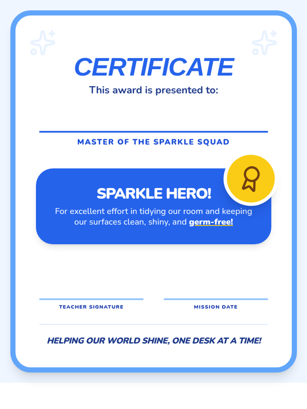 A celebratory certificate awarded to students for successfully completing the cleaning mission and demonstrating good hygiene habits.