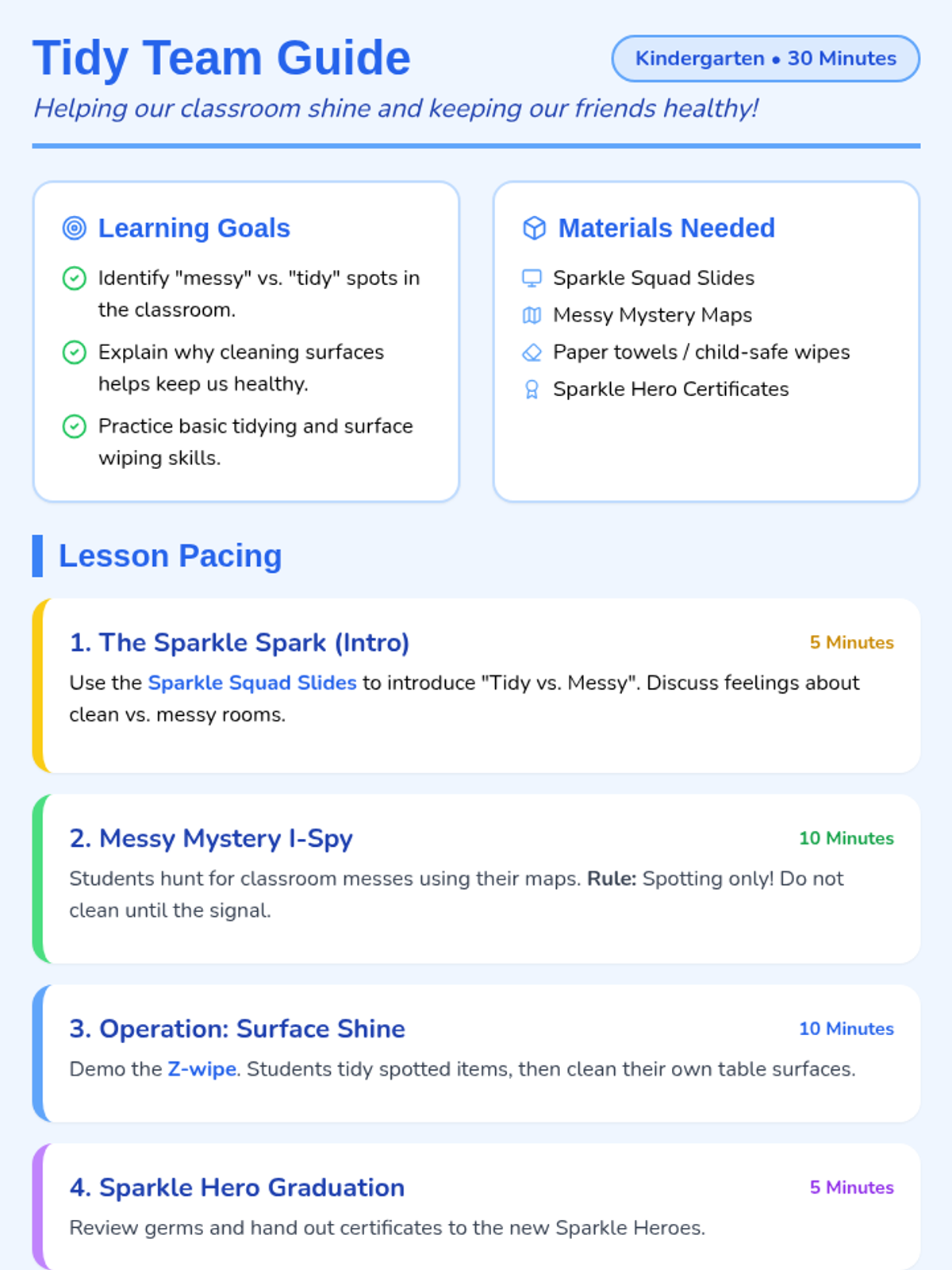 A comprehensive teacher guide for leading a 30-minute kindergarten lesson on tidying and cleaning. Includes learning goals, a detailed pacing guide, and instructional tips.