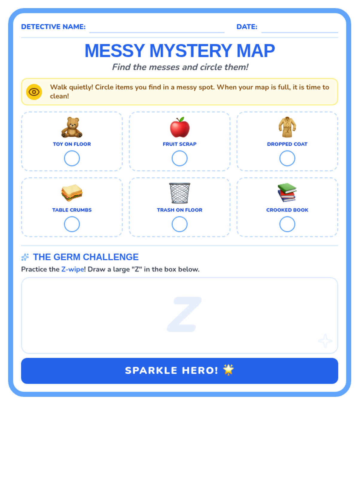 A visual I-Spy checklist for kindergarteners to identify messes in their classroom and practice the 'Z-wipe' surface cleaning technique. Designed with large icons and minimal text for early readers.