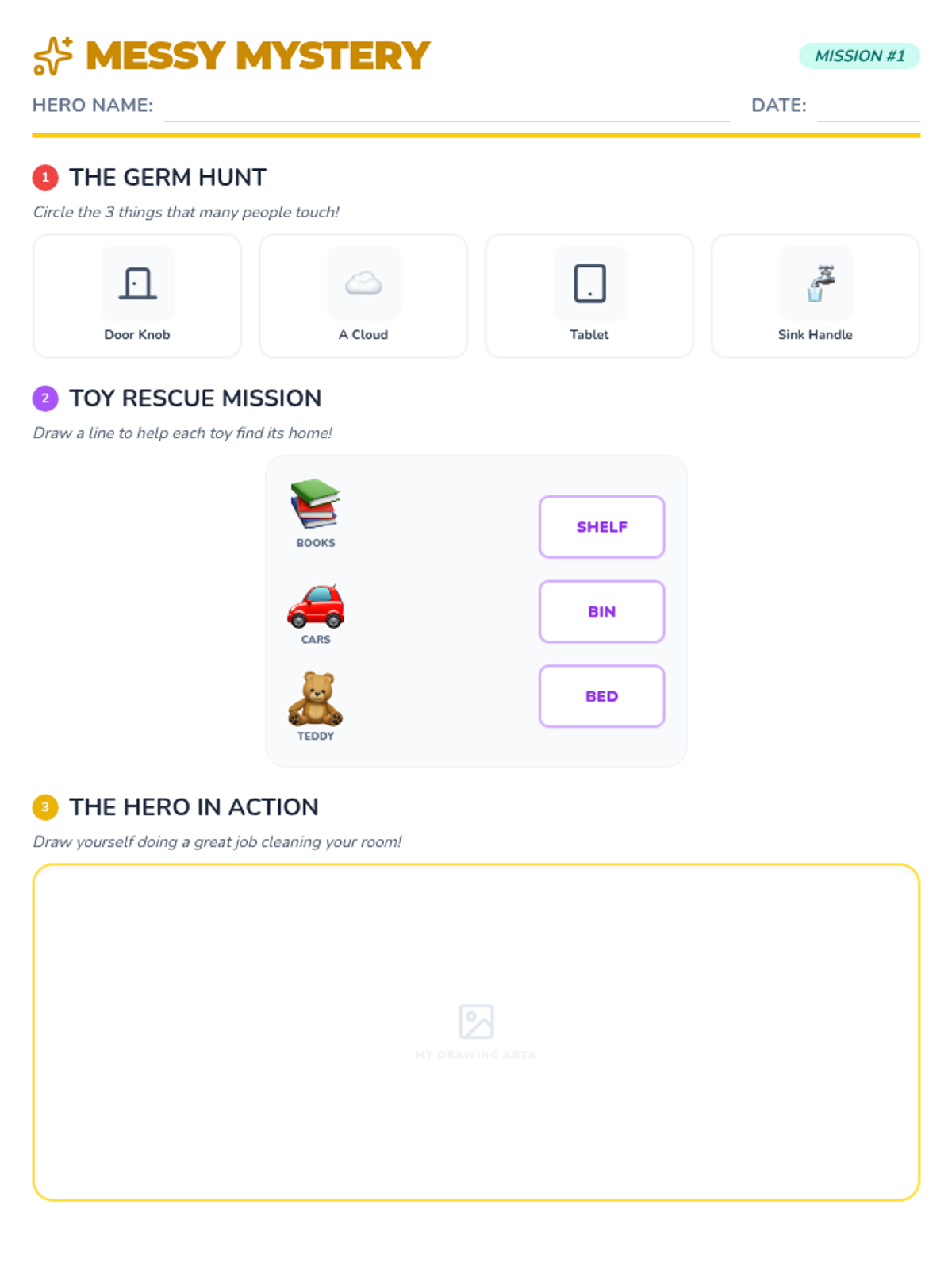 An interactive worksheet for 1st graders to practice identifying germ hotspots, matching toys to their proper storage locations, and visualizing their success as cleanliness heroes.