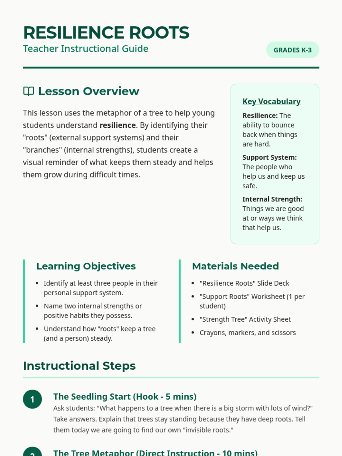 A comprehensive teacher instructional guide for 'The Resilience Roots' lesson, featuring learning objectives, vocabulary, step-by-step procedures, and differentiation strategies for grades K-3.