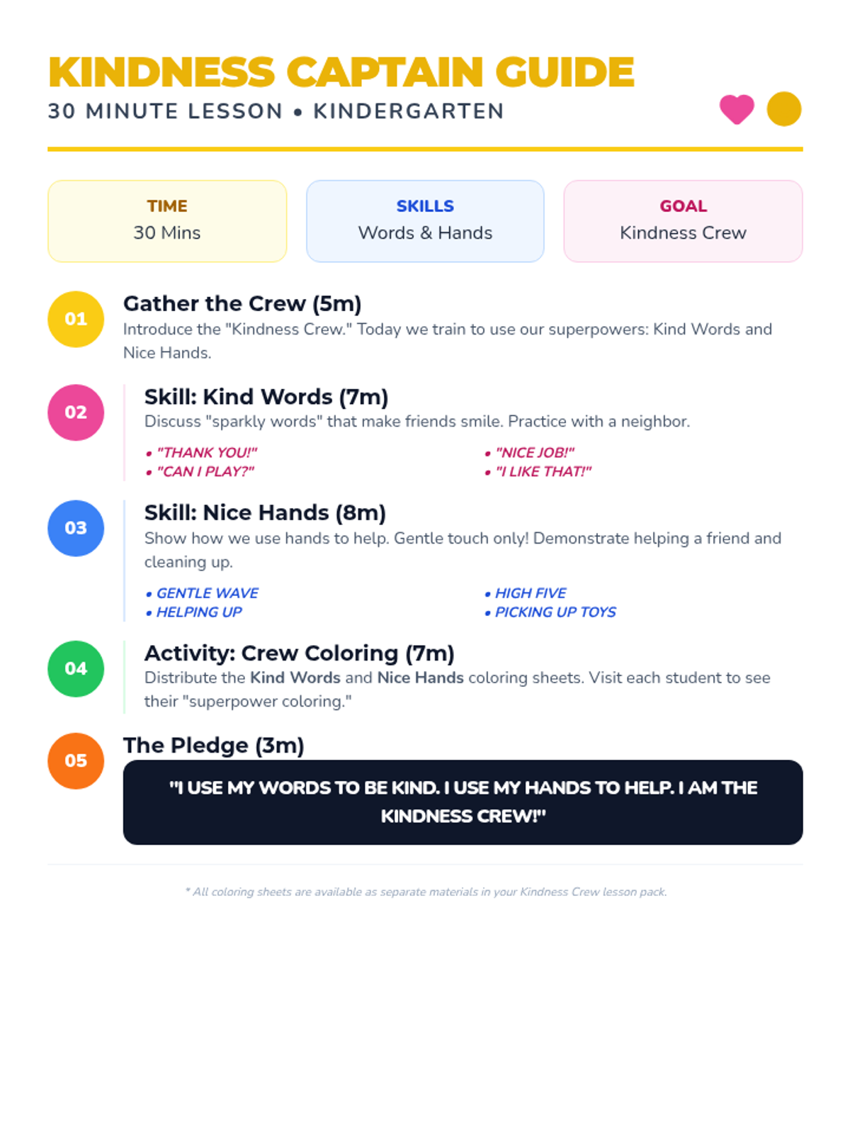 A comprehensive 30-minute lesson plan for kindergarten teachers, detailing the "Kindness Crew" activities, discussion prompts, and skills practice.