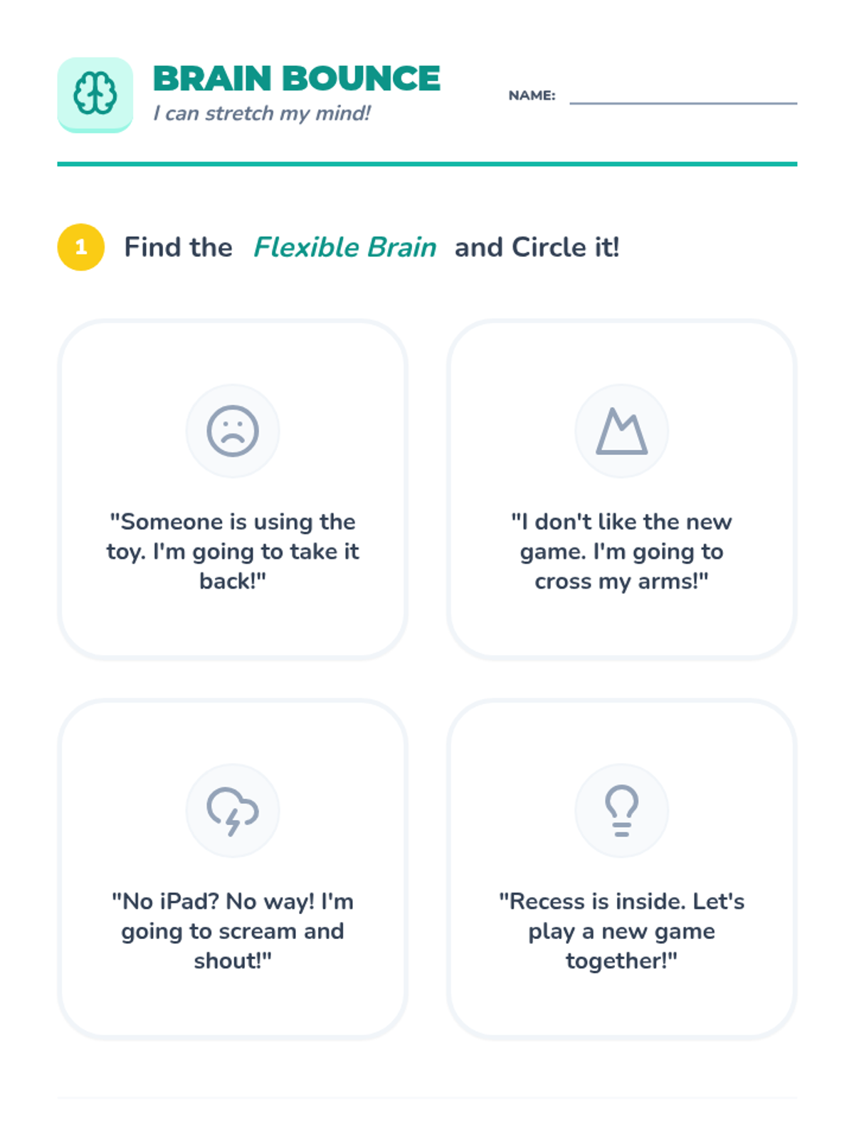 A student worksheet for kindergarteners to practice identifying flexible thinking. Includes a "spot the flexible choice" activity and a large drawing space for creative problem-solving in a specific lunchroom scenario. Revised for better page breaks and uniform styling.