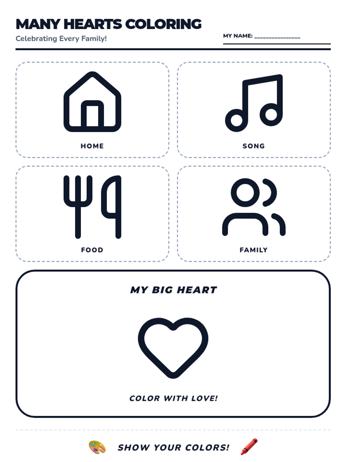 A clean and bold coloring page for Pre-K students featuring family and tradition icons like homes, food, and music, designed for easy coloring with large outlines.