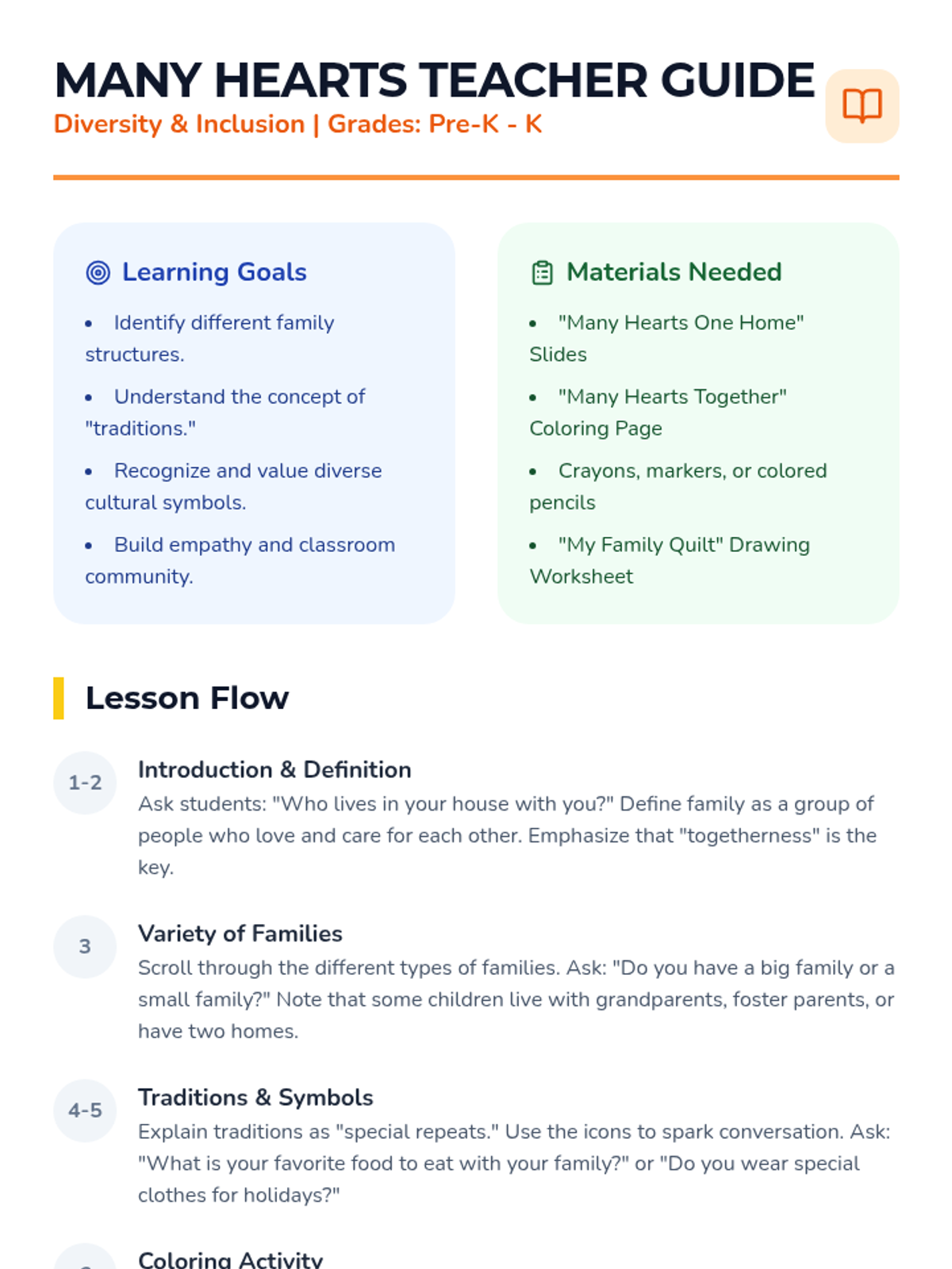 A comprehensive teacher's guide for the Many Hearts One Home lesson, including learning objectives, slide-by-slide talking points, and instructions for the coloring activity.