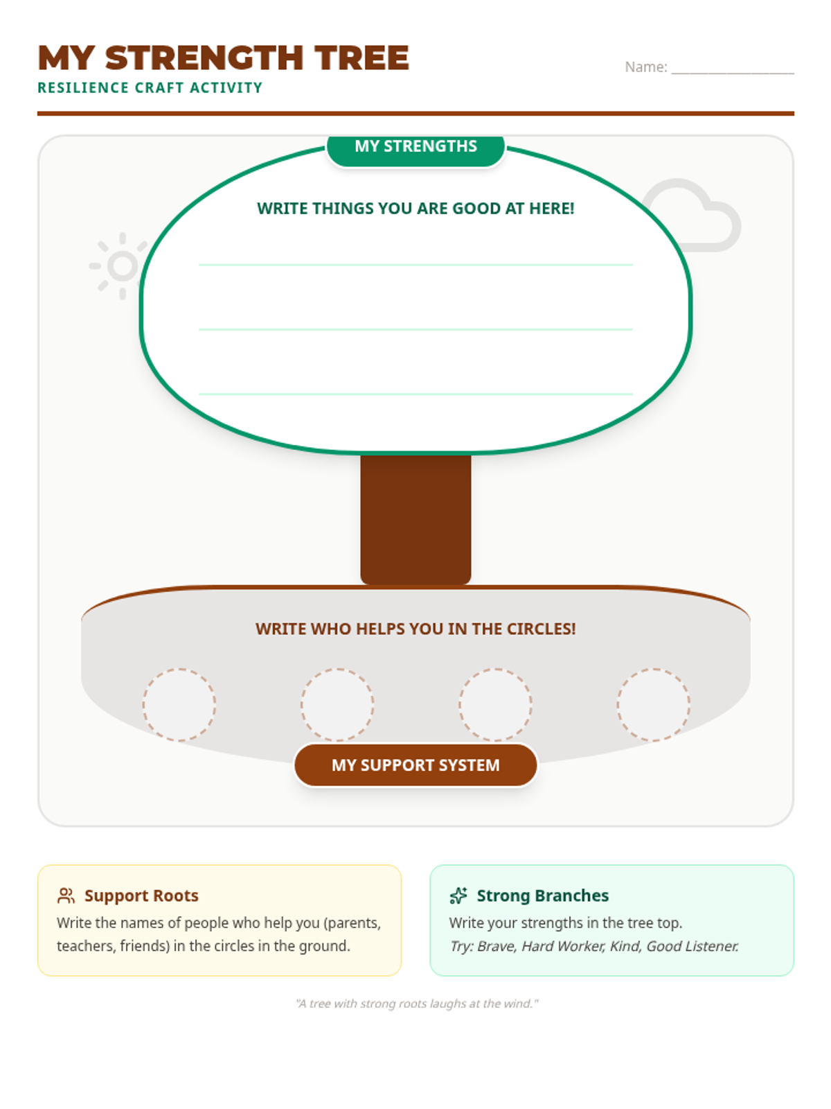A hands-on activity template where students build their own 'Strength Tree.' It features a large graphic organizer for writing support systems in the roots and personal strengths in the canopy.