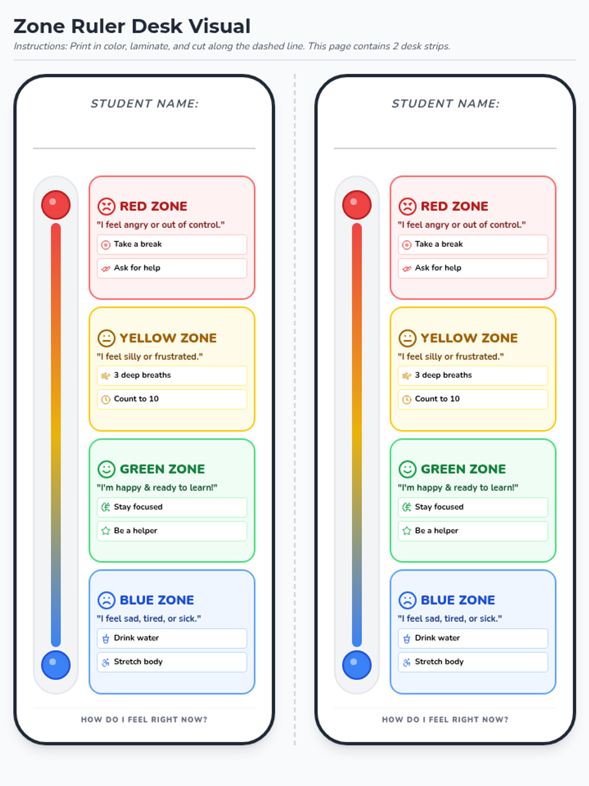 A revised vertical thermometer-style desk visual for 1st graders. Features more compact sizing to fit standard desks and a 1-page print layout with two visuals. Includes clear strategies, 'I feel' statements, and facial expression icons for each zone.