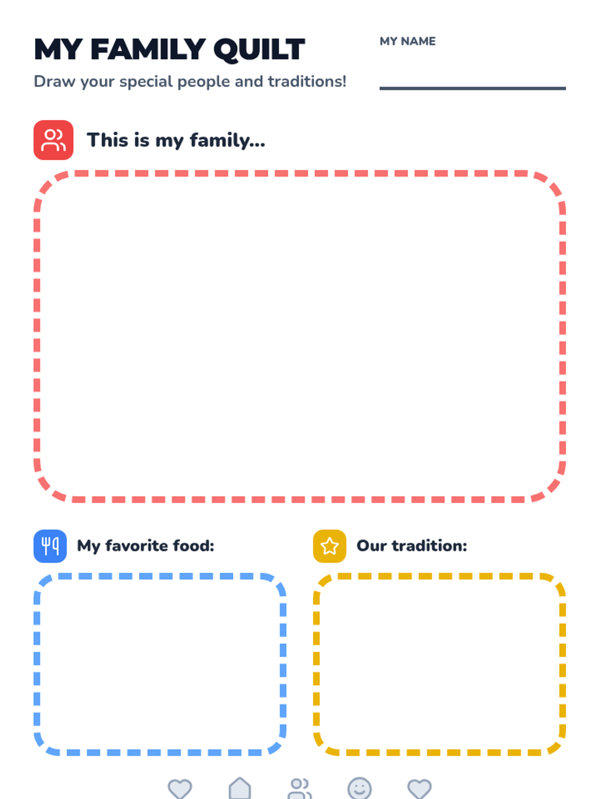 A creative drawing worksheet for Pre-K students to illustrate their family, a favorite food, and a family tradition, designed with large, open workspaces.