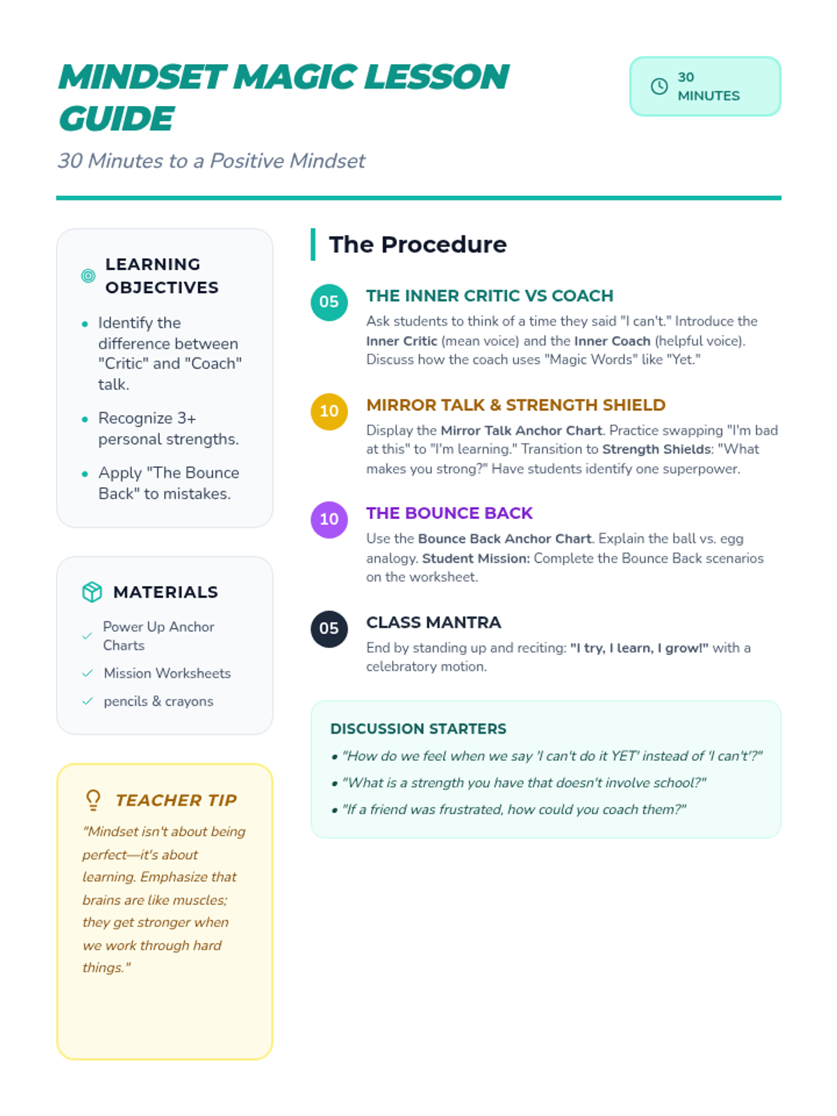 A comprehensive 30-minute lesson guide for teachers to lead a session on positive mindset, covering self-talk, personal strengths, and resilience strategies. Consolidated for single-page use.