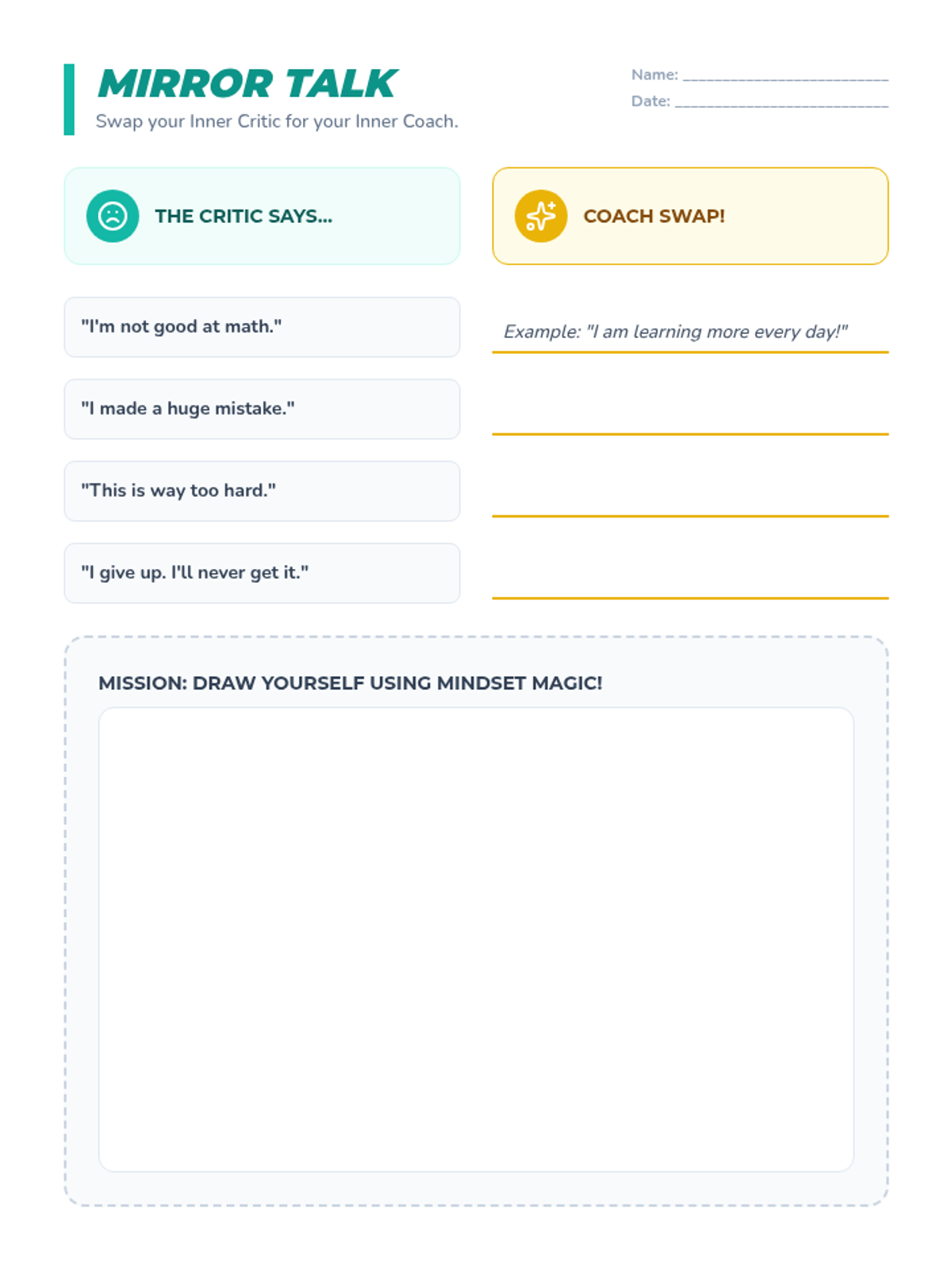 A set of three student worksheets for a positive mindset lesson: "Mirror Talk" (self-talk practice), "Strength Shield" (personal strengths), and "The Bounce Back" (resilience scenarios). Redesigned for handwriting legibility and proper page flow.