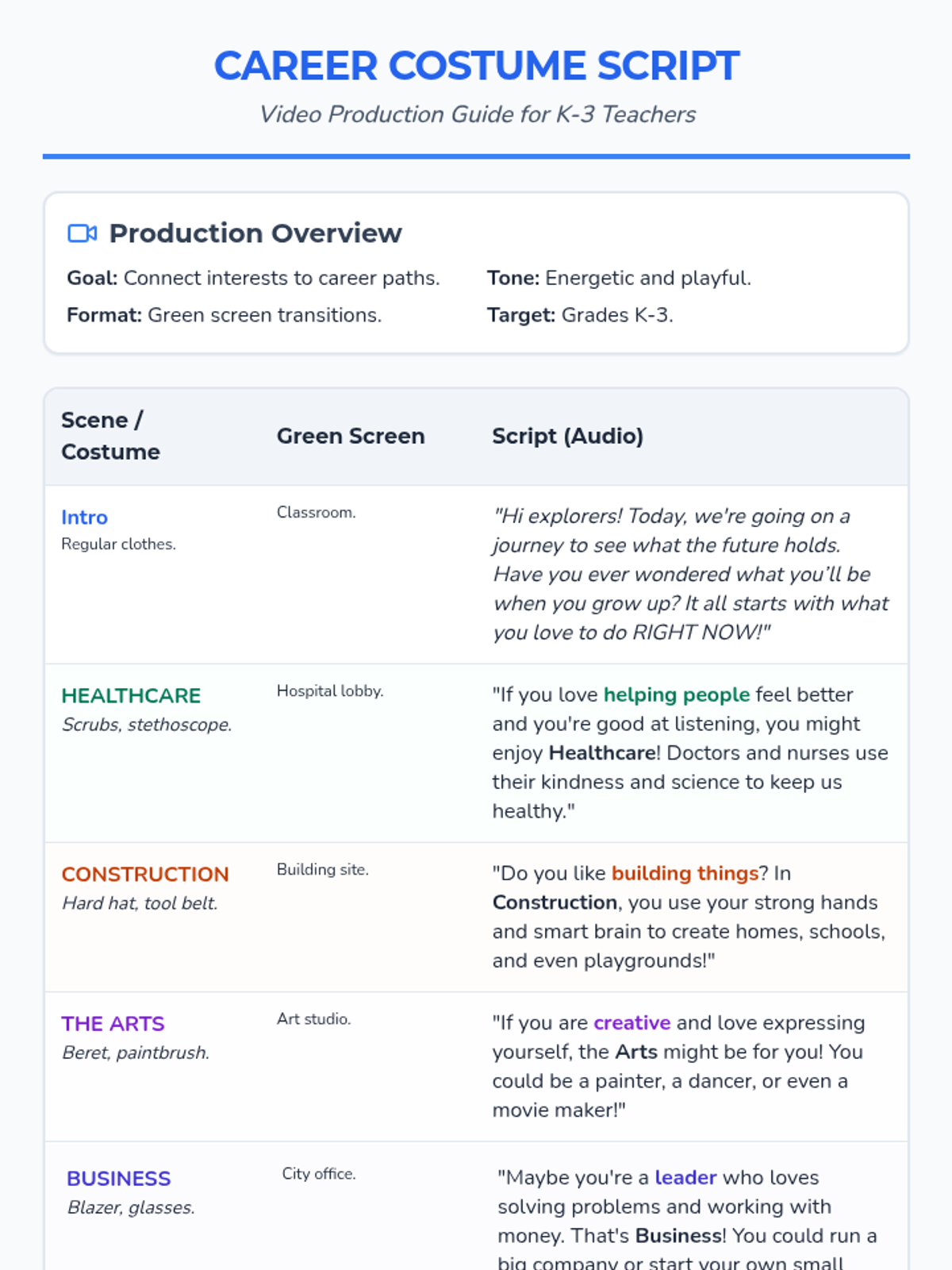 A production guide and script for a K-3 career exploration video. It includes outfit ideas, green screen background suggestions, and a student-friendly script focused on career types.