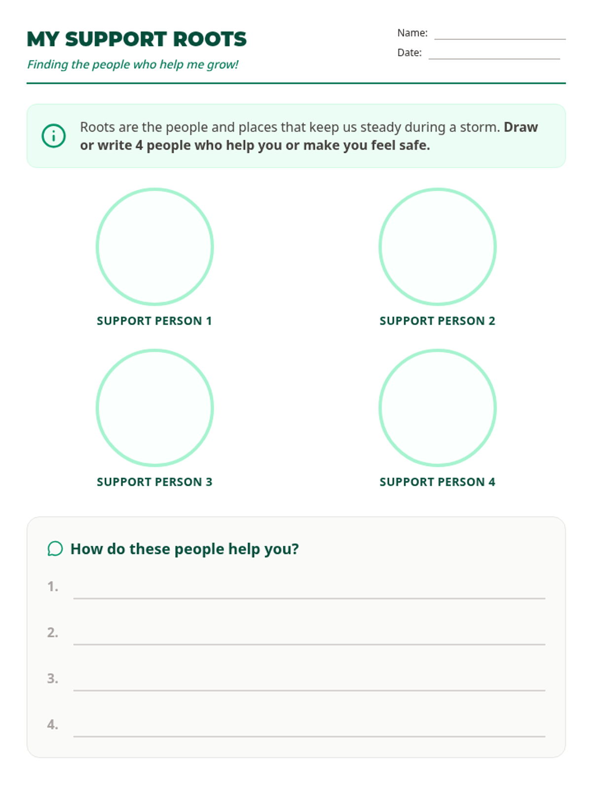 A student-facing worksheet for brainstorming support systems. Students draw or write the names of four key support figures in 'roots' circles, followed by a short reflection on how these people help them.