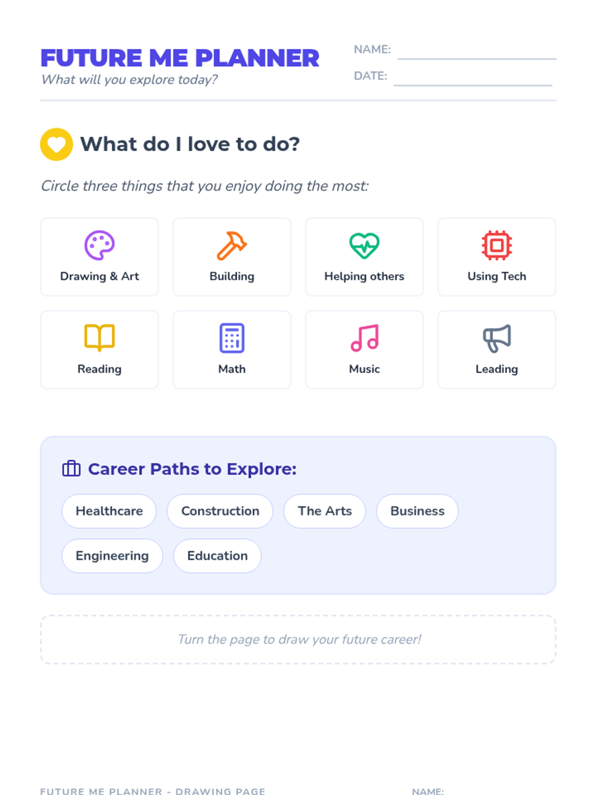 A student worksheet for reflecting on personal interests and connecting them to potential career clusters. Includes a large drawing area and sentence starters for early writers.