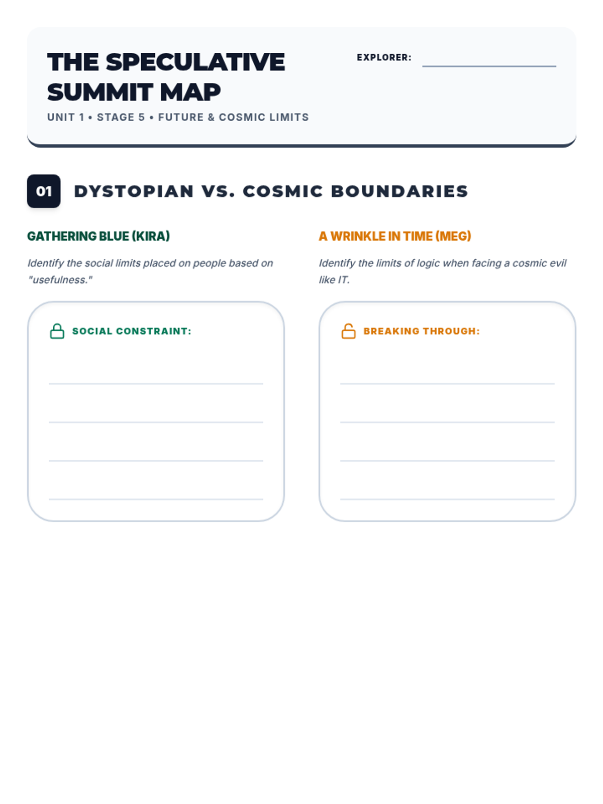 A final planning worksheet for Week 5 focusing on character gifts and societal boundaries in 'Gathering Blue' and 'A Wrinkle in Time'. Updated with white work areas for legibility and unified page structure.