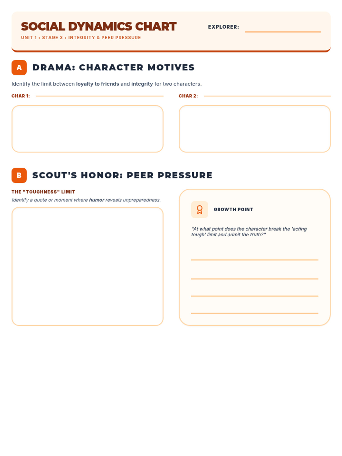 A worksheet for Week 3 analyzing character motives in drama and peer pressure in fiction. Updated for better spacing and one-page layout.