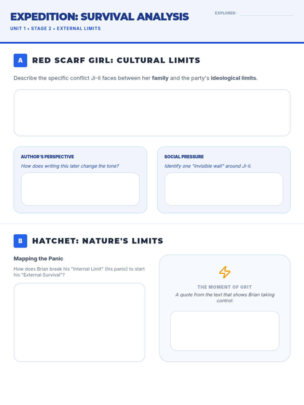 A comparative worksheet for Week 2 analyzing the social and physical survival limits in 'Red Scarf Girl' and 'Hatchet'. Updated for better spacing and to fit on a single page.
