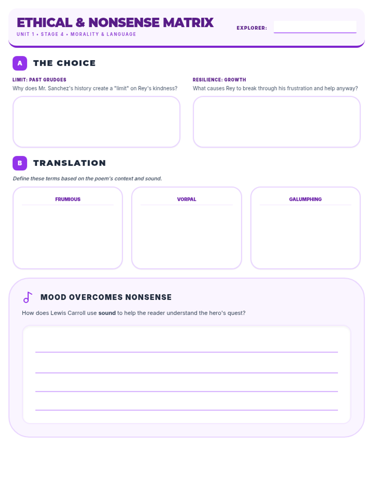 A worksheet for Week 4 analyzing moral dilemmas in 'Good Samaritan' and word-play in 'Jabberwocky'. Updated for one-page fit and improved writing space for Part C.