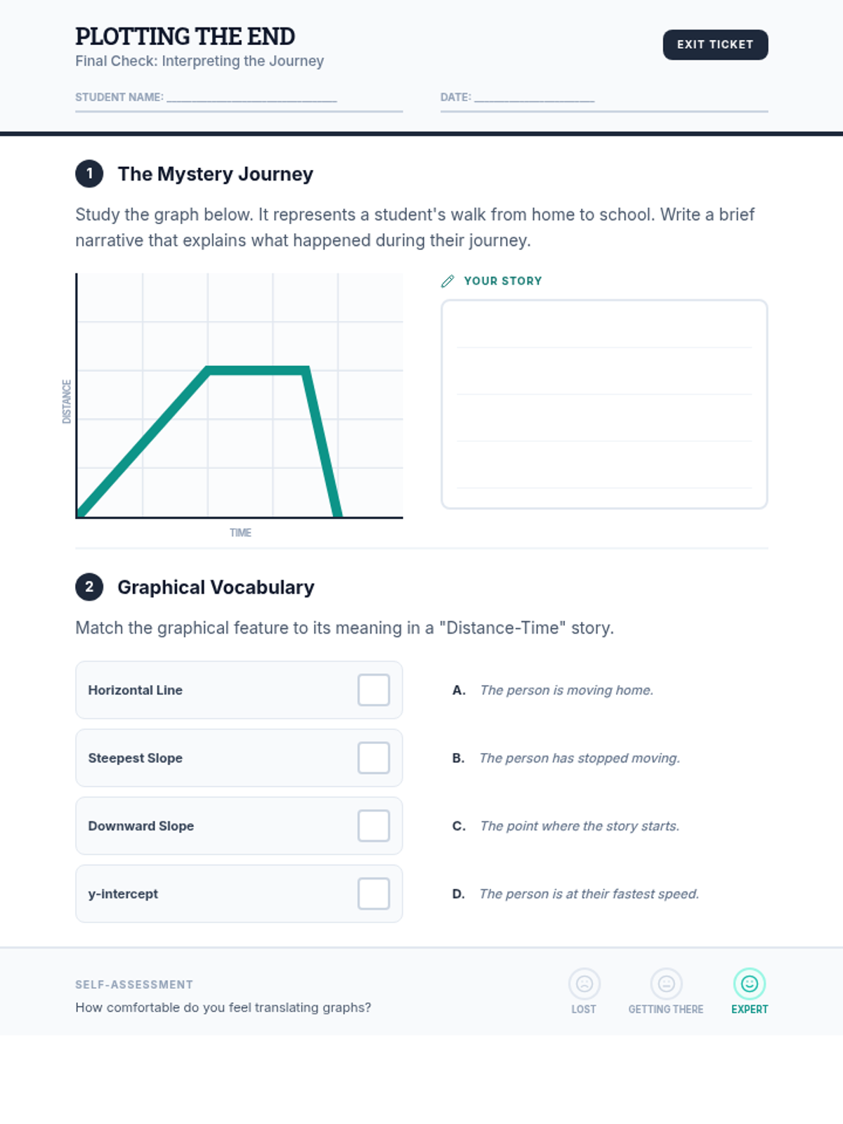 A quick assessment for students to demonstrate their ability to interpret a line graph as a narrative and identify key graphical features like slope and intercepts. Optimized for 8.5x11 printing with 1-inch margins.