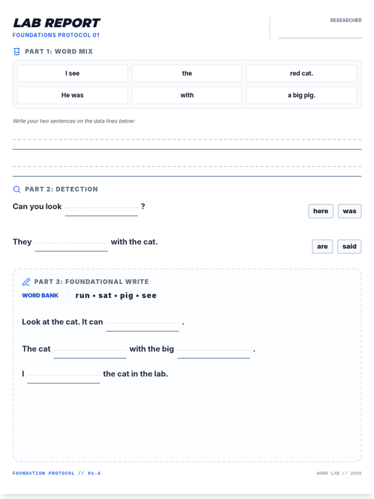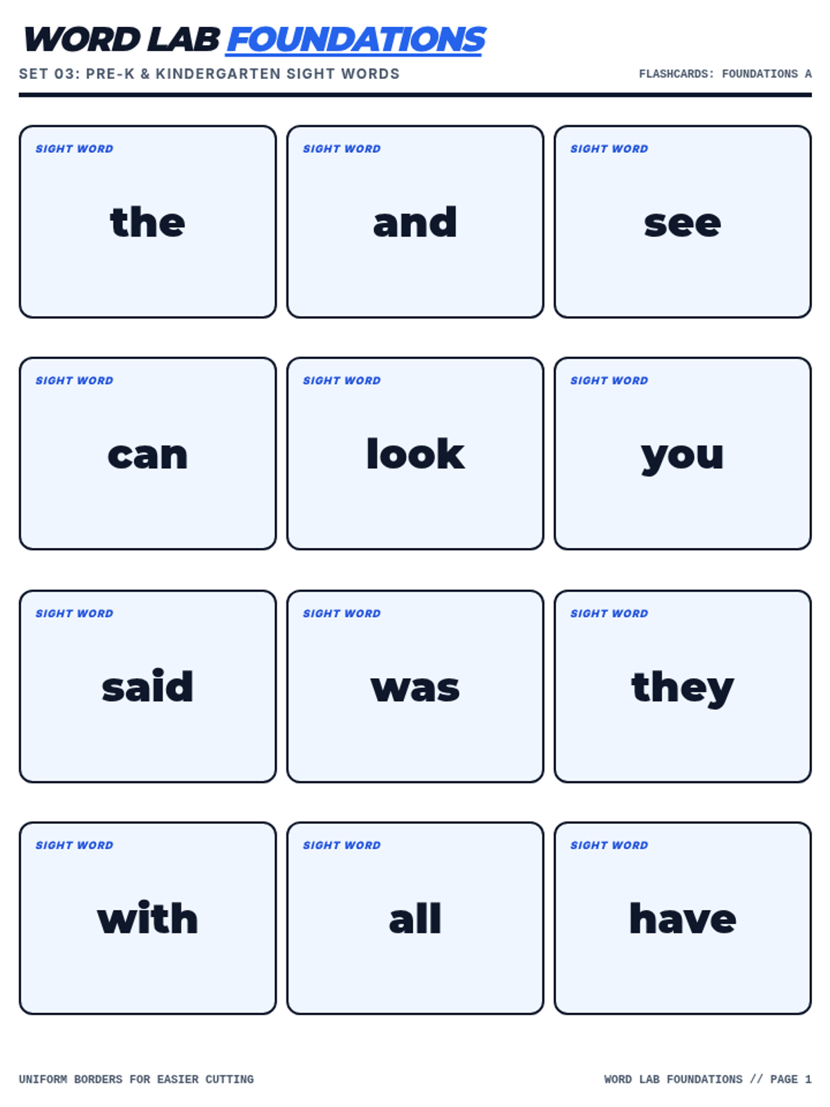 A two-page set of printable flashcards focusing on Pre-K through 1st Grade sight words and early CVC decoding patterns. The cards maintain the 'Word Lab' theme with a clean, high-contrast design suitable for older students.