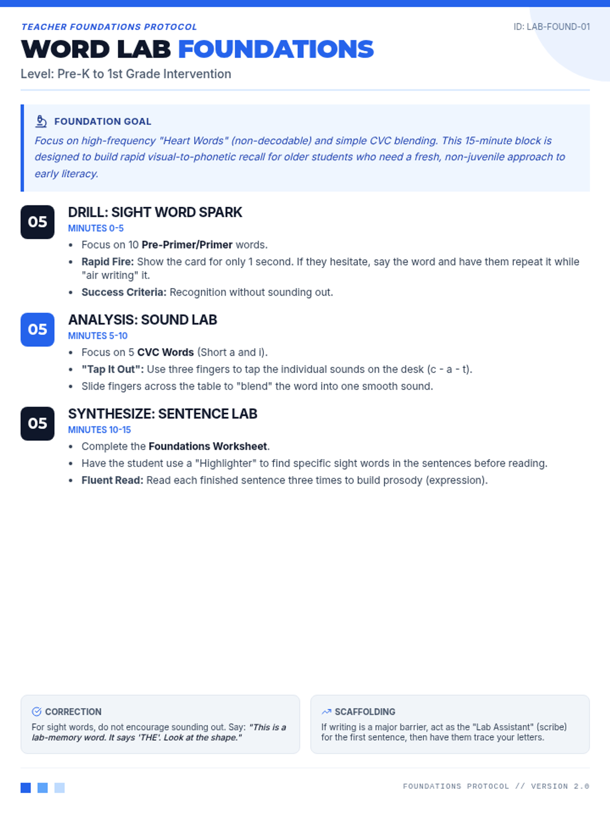 A 15-minute daily teacher routine focused on Pre-K to 1st Grade foundations. It outlines a structured three-phase approach for sight word recognition, phonics-based CVC decoding, and sentence-level application, tailored for older students with significant delays.