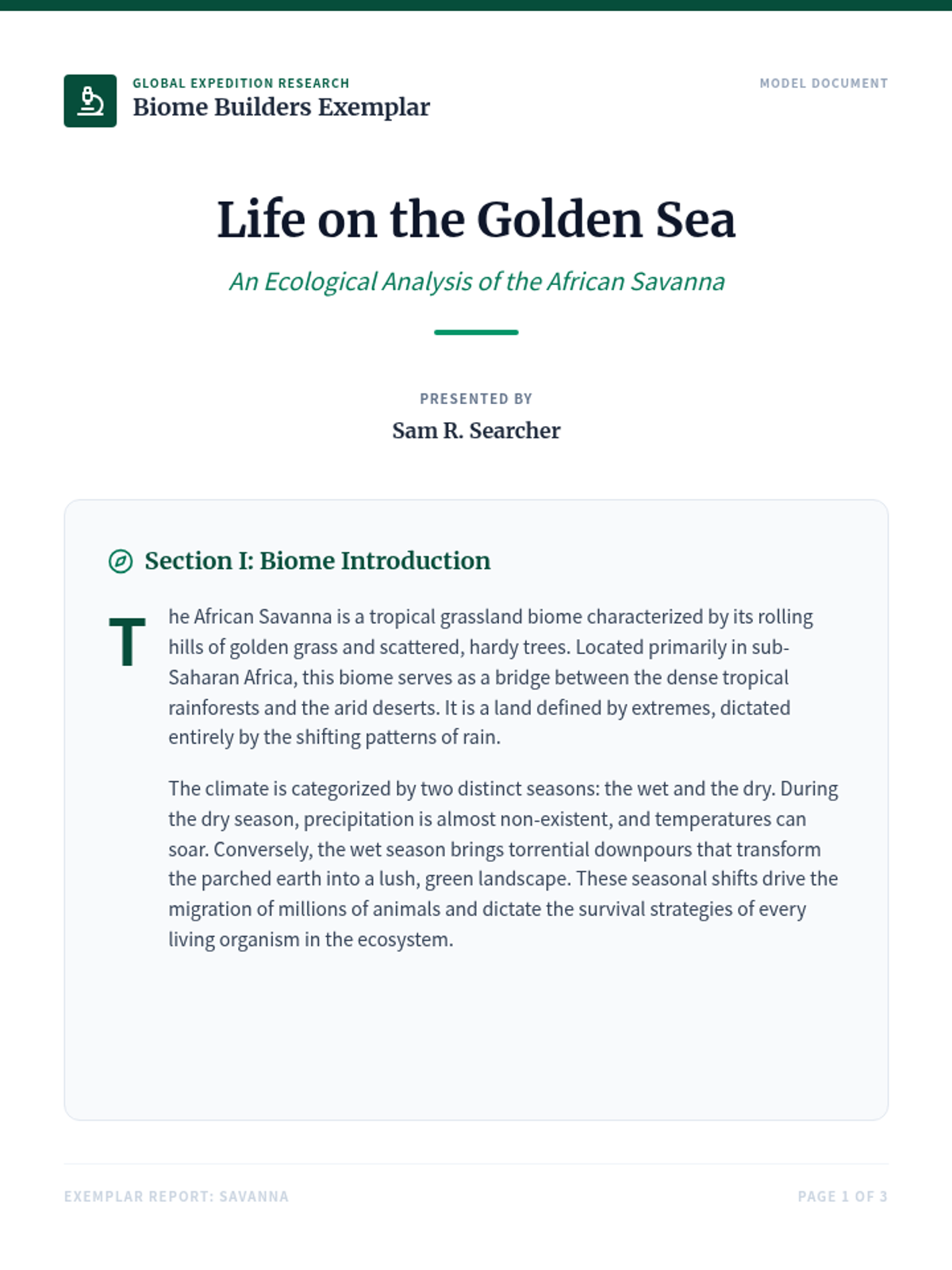 An exemplar research paper for the Biome Builders project, focusing on the African Savanna. This model document demonstrates the required structure, scientific depth, and bibliography formatting expected of students. Optimized for 8.5x11 printing across 3 pages.
