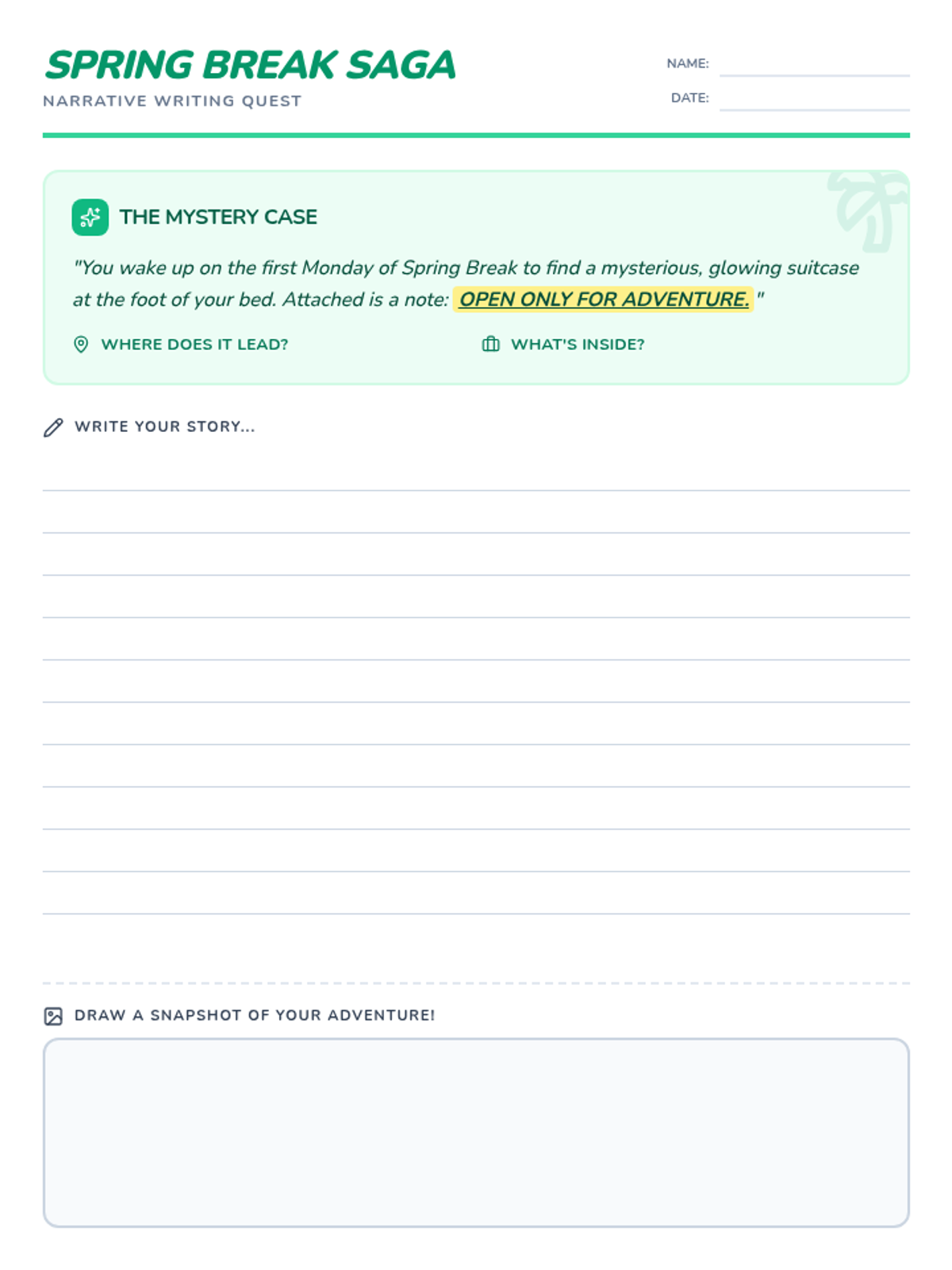 A creative narrative writing worksheet for 3rd graders featuring a mysterious suitcase prompt to spark spring break adventure stories.