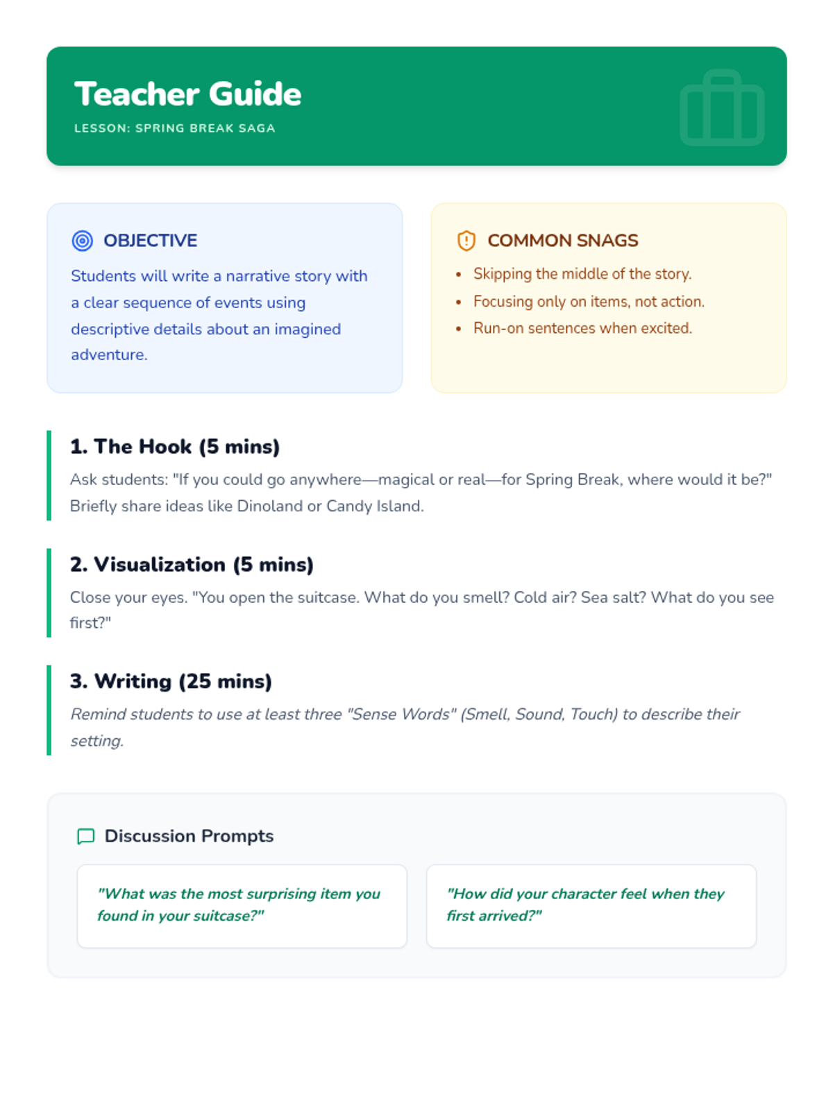 A teacher's facilitation guide for the Spring Break Saga writing lesson, including objectives, hooks, and discussion prompts.
