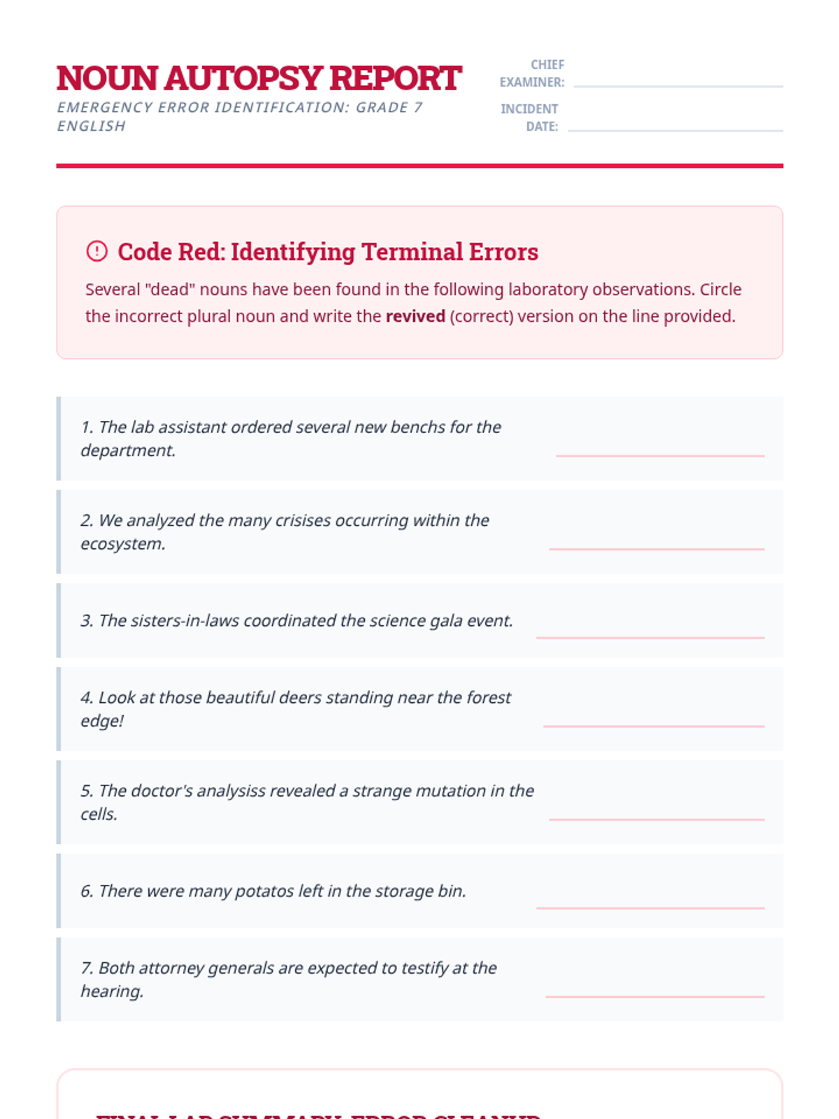 An error-correction worksheet themed as a "Noun Autopsy Report" where students identify and fix incorrectly pluralized nouns in 7th-grade level sentences and paragraphs. Corrected error count and added writing lines.